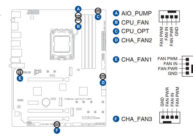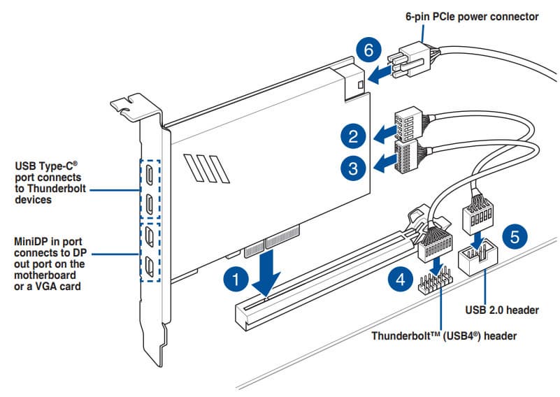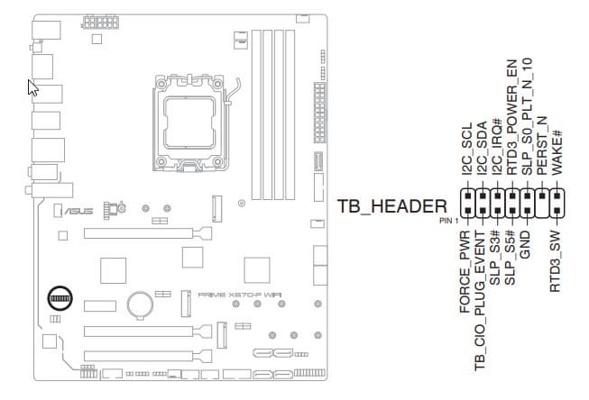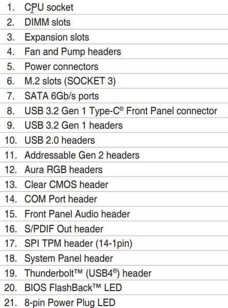 | Прочие внутренние элементы | 24-контактный разъем питания ATX 1 8-контактный разъем питания EPS12V 1 4-контактный разъем питания EPS12V 1 слот M.2 (E-key), занят адаптером беспроводных сетей 1 разъем для подключения порта USB 3.2 Gen1 Type-C 2 разъема для подключения 4 портов USB 3.2 Gen1 2 разъема для подключения 4 портов USB 2.0 6 разъемов для подключения 4-контактных вентиляторов и помп ЖСО 2 разъема для подключения неадресуемой RGB-ленты 3 разъема для подключения адресуемой ARGB-ленты 1 разъем аудио для передней панели корпуса 1 разъем для устройств безопасности TPM 1 разъема подключения фирменных карт Asus Thunderbolt 1 разъем для подключения управления с передней панели корпуса 1 разъем сброса CMOS |