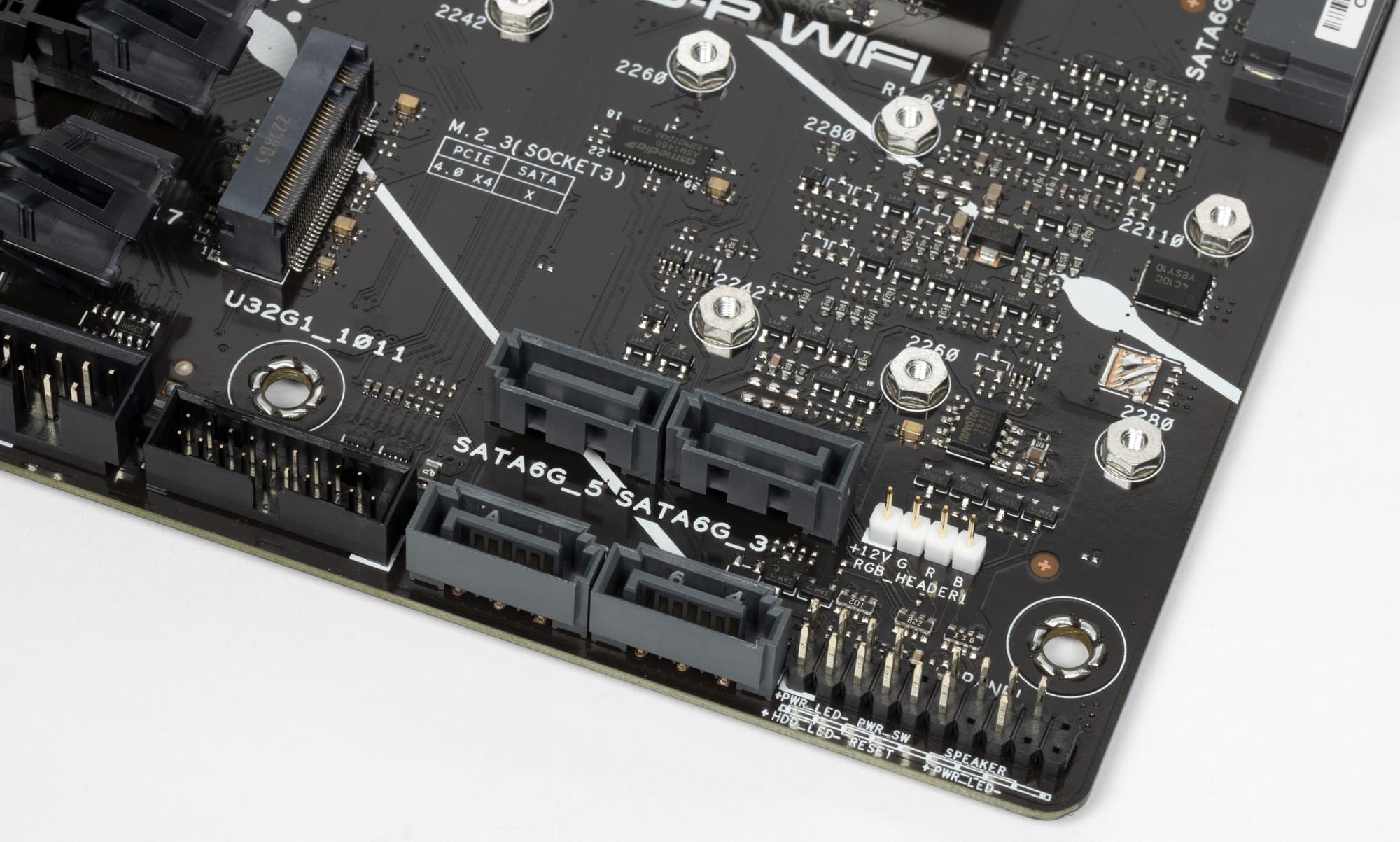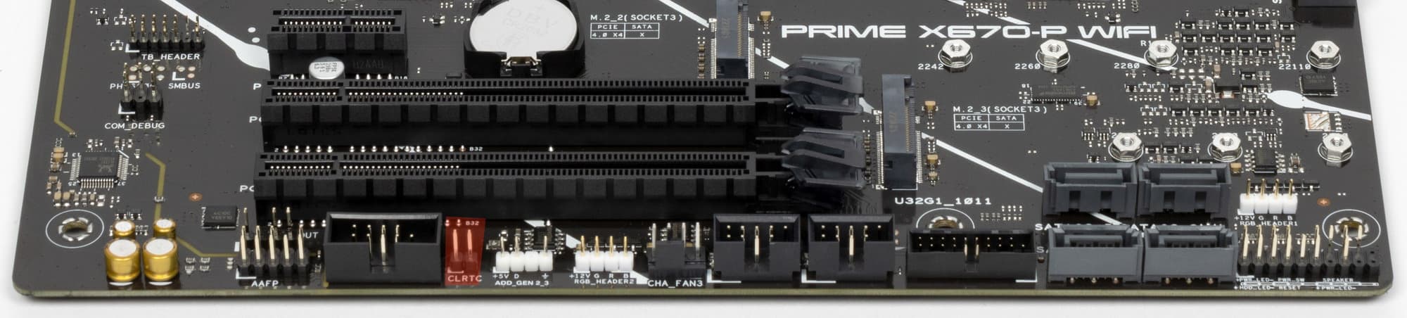 Третий слот M.2 (M2_3) получает данные от чипсета X670 (PCIe 4.0), а первые два — от CPU (M.2_1 – PCIe 5.0, M.2_2 – PCIe 4.0). При этом все слоты работают с модулями только с PCIe интерфейсом и поддерживают размеры модулей: 2242/2260/2280, а слот М.2_2 поддерживает размер модулей 22110. На всех M.2 можно организовать RAID.