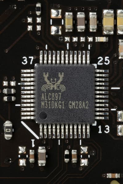 Мы знаем, что ранее самым популярным в большинстве современных материнских платах звуковым кодеком был Realtek ALC1220, обеспечивающий вывод звука по схемам до 7.1 с разрешением до 24 бит / 192 кГц . Ныне на матплатах топового уровня встречается уже ALC4082 того же производителя с улучшенными характеристиками 32 бит / 384 кГц. Но данная плата оснащена очень старым бюджетным кодеком Realtek ALC897.