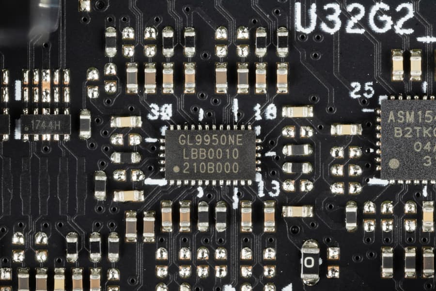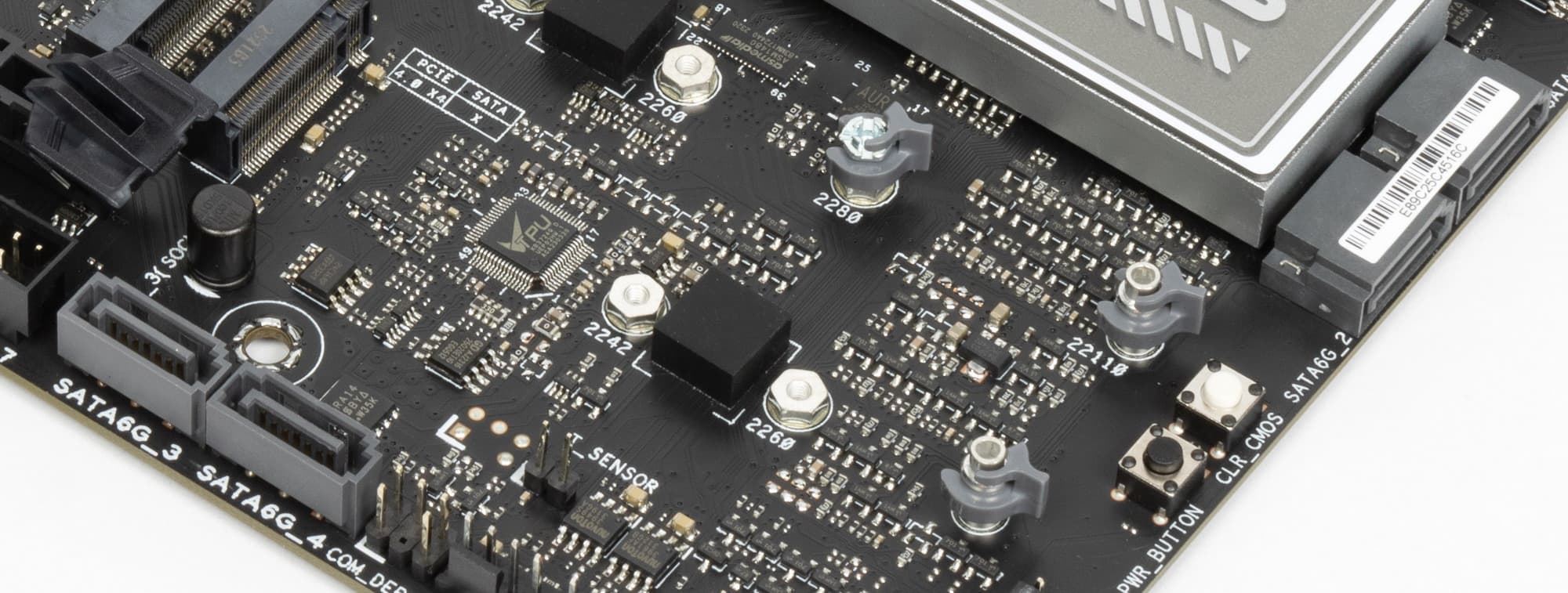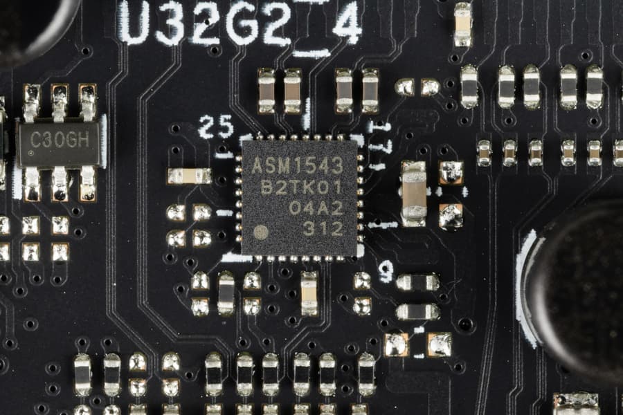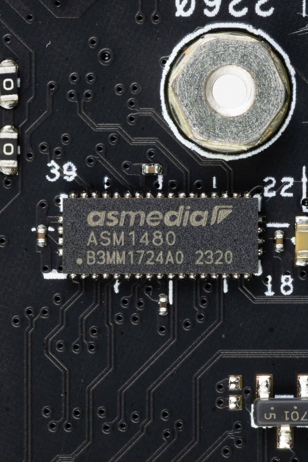 Особо надо отметить, что 2 порта SATA 1/2 и слот M.2_2 делят линии PCIe 3.0 между собой, то есть если слот M.2_2 будет занят, то порты SATA 1 и 2 отключатся. В силу данной нужды в перераспределении ресурсов на матплате имеется мультиплексор от ASMedia.