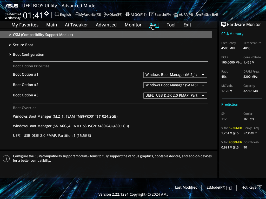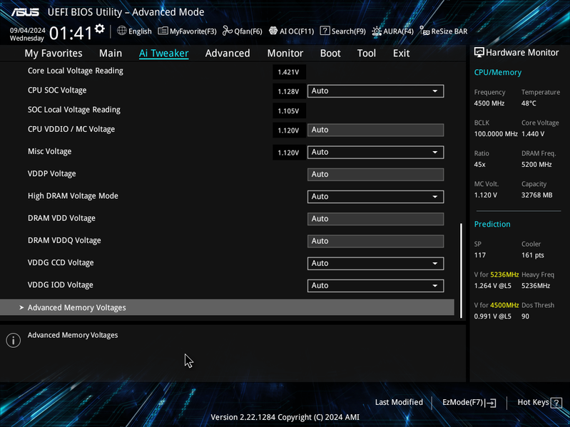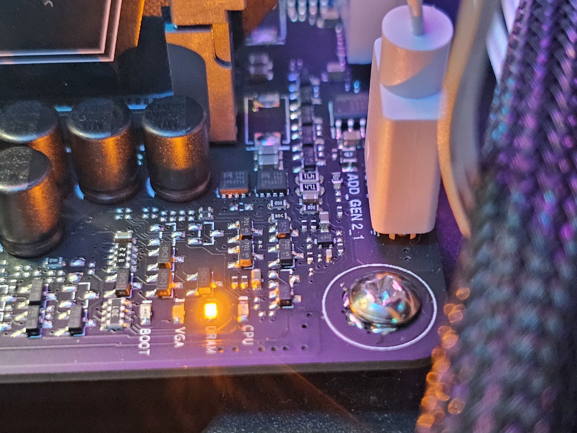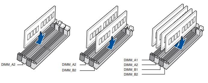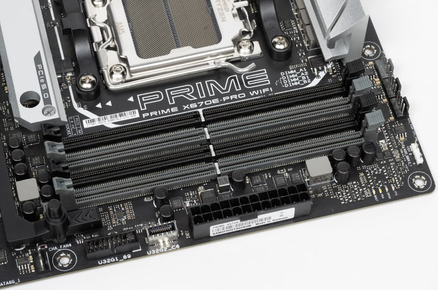 Для установки модулей памяти на плате имеется четыре DIMM-слота (для работы памяти в Dual Channel в случае использования всего 2 модулей их следует устанавливать в А2 и B2). Плата поддерживает небуферизованную память DDR5, а максимальный объем памяти составляет 192 ГБ. Поддерживаются профили XMP и Expo.