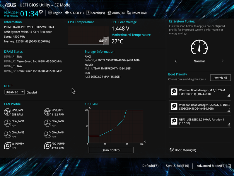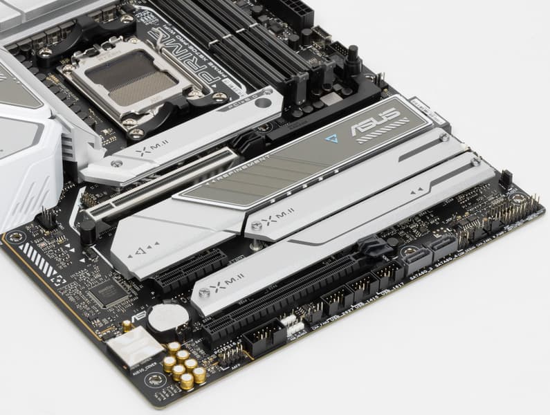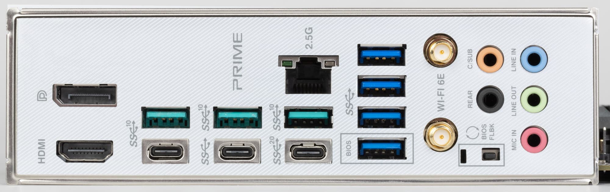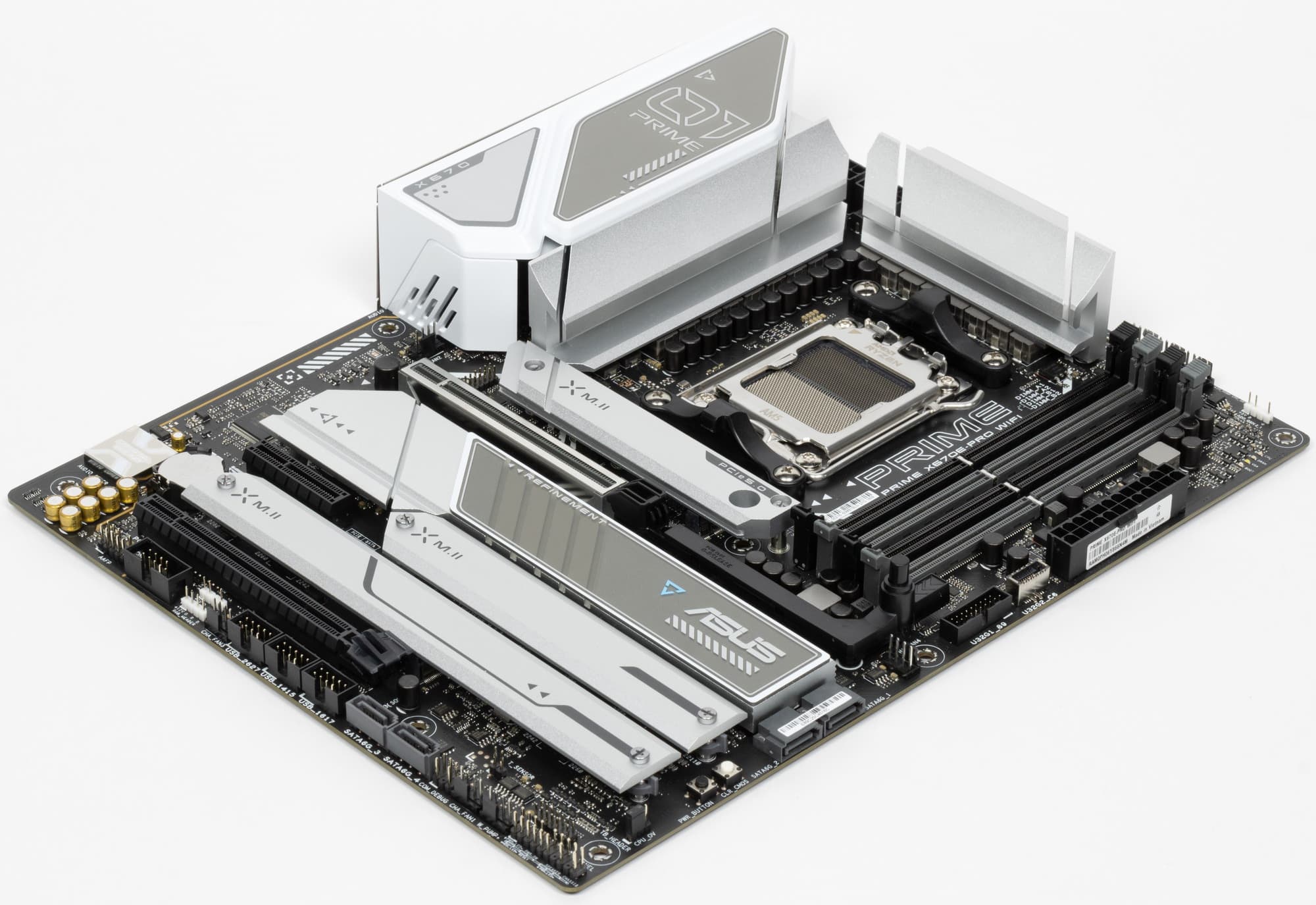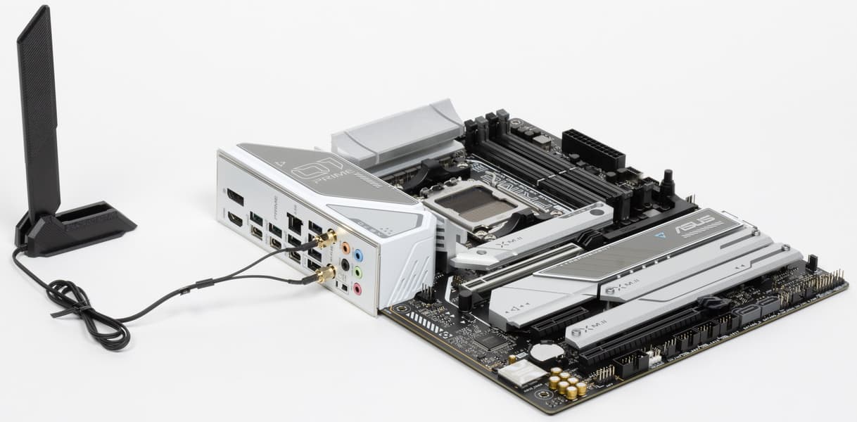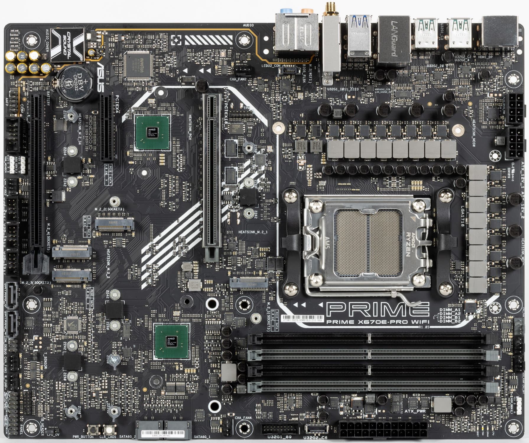 У Asus Prime X670E-Pro WiFi имеется 19 портов USB разных видов, включая быстрые USB 3.2 Gen2 (как Type-A, так и Type-C), а также USB 3.2 Gen2×2 в виде порта Type-C. Плата предлагает 1 слот PCIe х16_1, который получает от процессора 16 линий PCIe версии 5.0, также имеется 1 слот PCIe x16_2 (работающий только в режиме x4) и 1 слот PCIe x4 (оба последних подключены к чипсету).