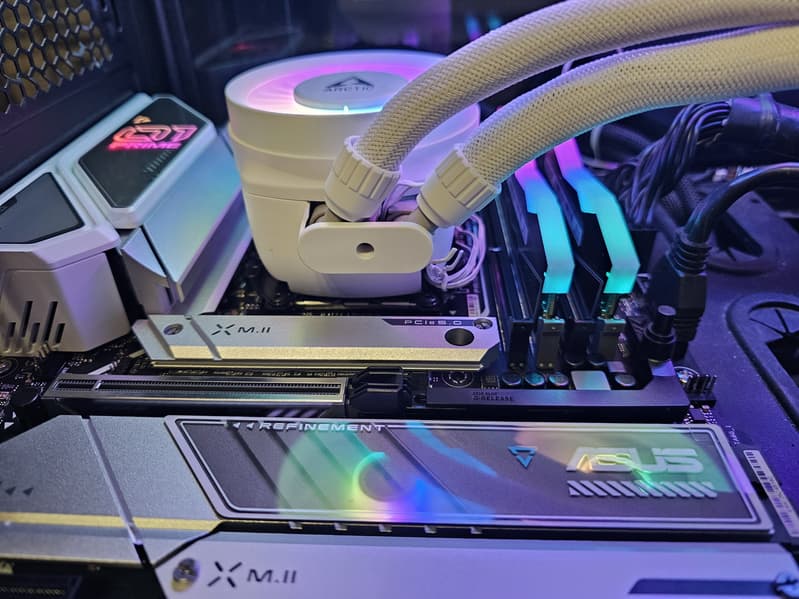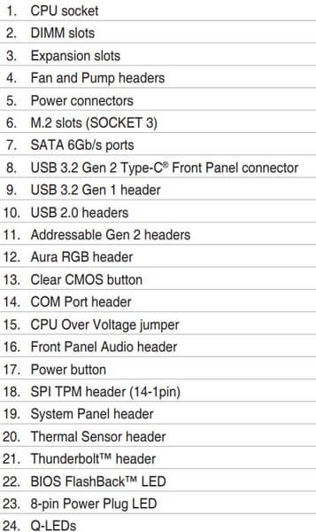 | Прочие внутренние элементы | 24-контактный разъем питания ATX 2 8-контактных разъема питания EPS12V 1 слот M.2 (E-key), занят адаптером беспроводных сетей 1 разъем для подключения порта USB 3.2 Gen2 Type-C 1 разъем для подключения 2 портов USB 3.2 Gen1 3 разъема для подключения 6 портов USB 2.0 8 разъемов для подключения 4-контактных вентиляторов и помп ЖСО 1 разъем для подключения неадресуемой RGB-ленты 2 разъема для подключения адресуемой ARGB-ленты 1 разъем аудио для передней панели корпуса 1 переключатель CPU OV 1 разъем для термодатчика 1 разъем для подключения систем безопасности TPM 1 разъем для подключения устройств через COM-порт 1 разъем для подключения управления с передней панели корпуса 1 разъем для подключения дискретных карт Thunderbolt |