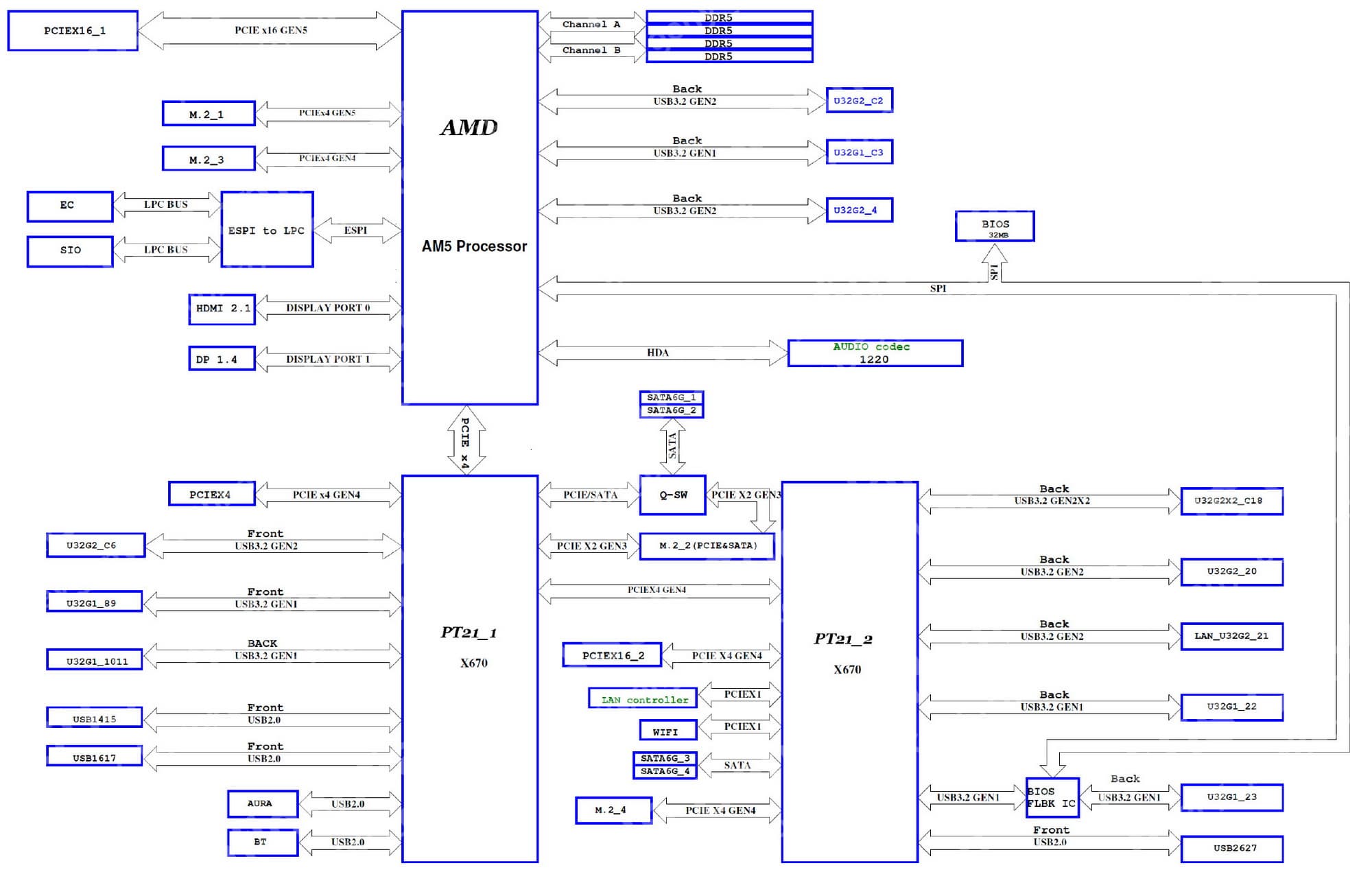 20 линий PCIe оказались занятыми (12 PCIe 4.0 + 8 PCIe 3.0). В процессорах Ryzen встроен контроллер High Definition Audio (HDA), в данном случае связь с аудиокодеком идет путем эмуляции PCI шины. Также один USB 2.0 расходуется на поддержку BT (при наличии слота M.2 (key E) и контроллер Aura Sync для своих нужд используют сигнальные линии USB 2.0 Детально об этом ниже в разделе USB-портов.