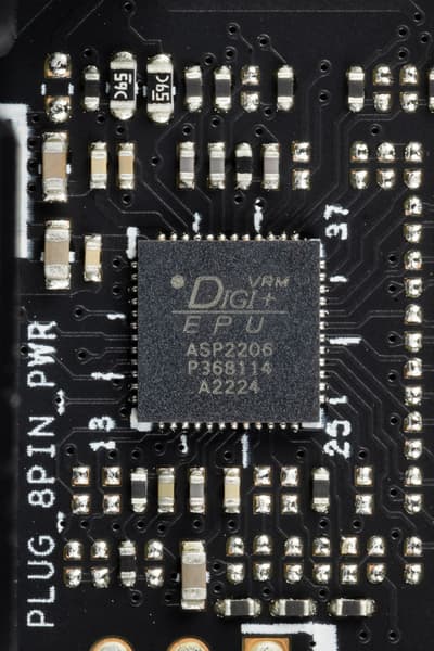 Управляет обоими наборами фаз (14+2) фирменный ШИМ-контроллер Digi+ ASP2206.