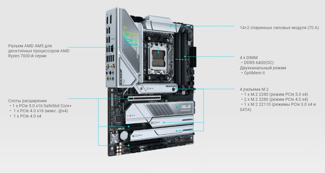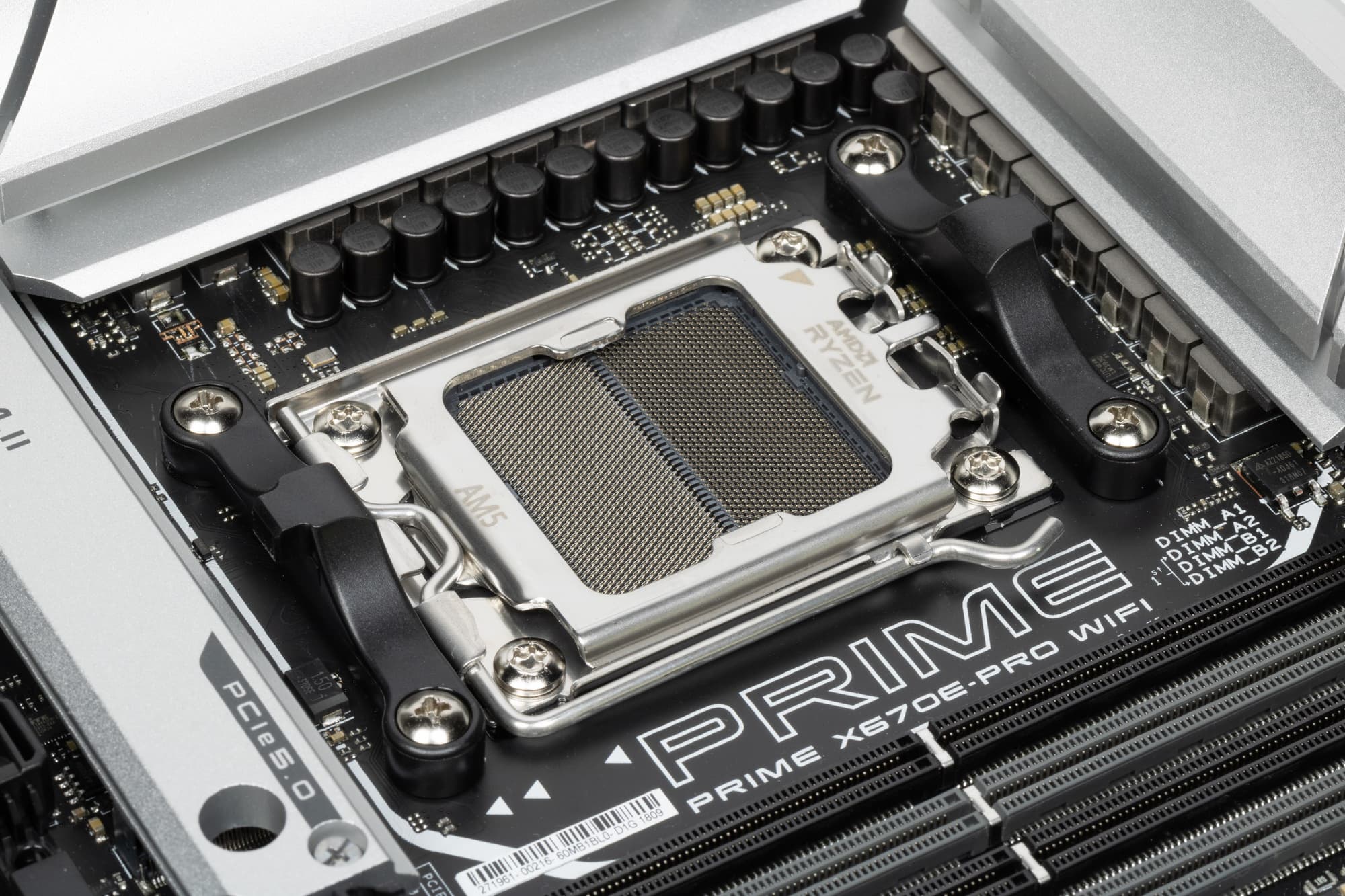 Плата Asus поддерживает процессоры AMD поколения 7000/8000/9000, выполненные под разъем (сокет) AM5.