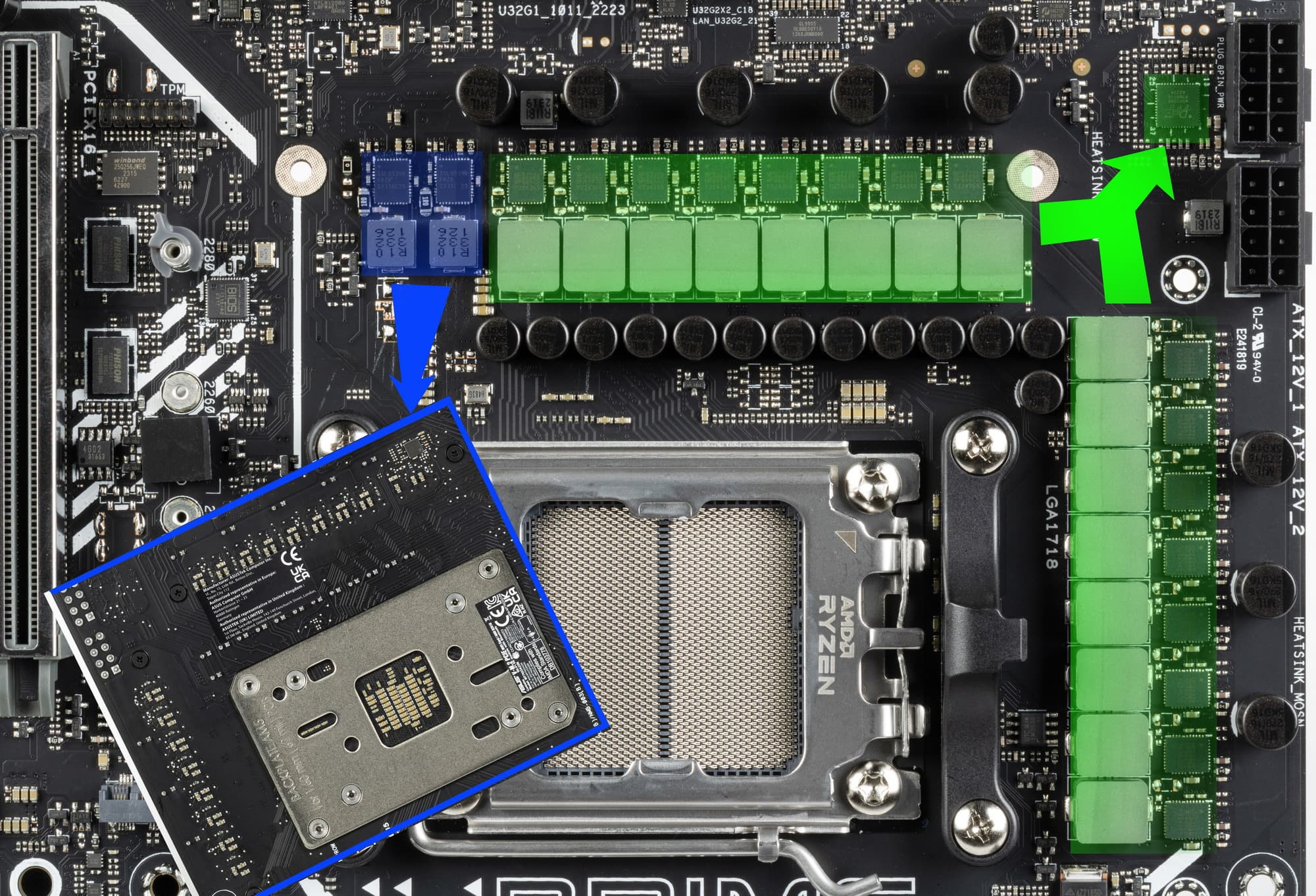 Внешне схема питания выглядит как 14+2+2: 14 фаз — ядро процессора, 2 фазы — SoC (I/O-чиплет Ryzen), 2 фазы — VDD_MISC (вывод встроенной графики).
