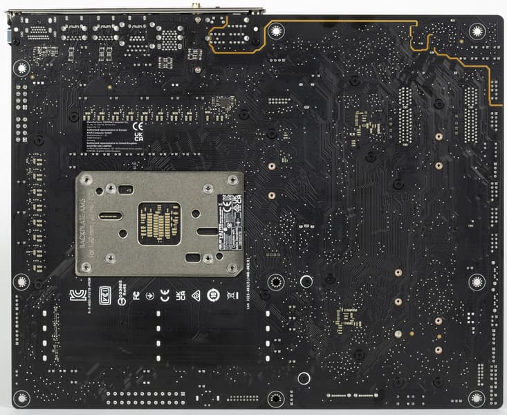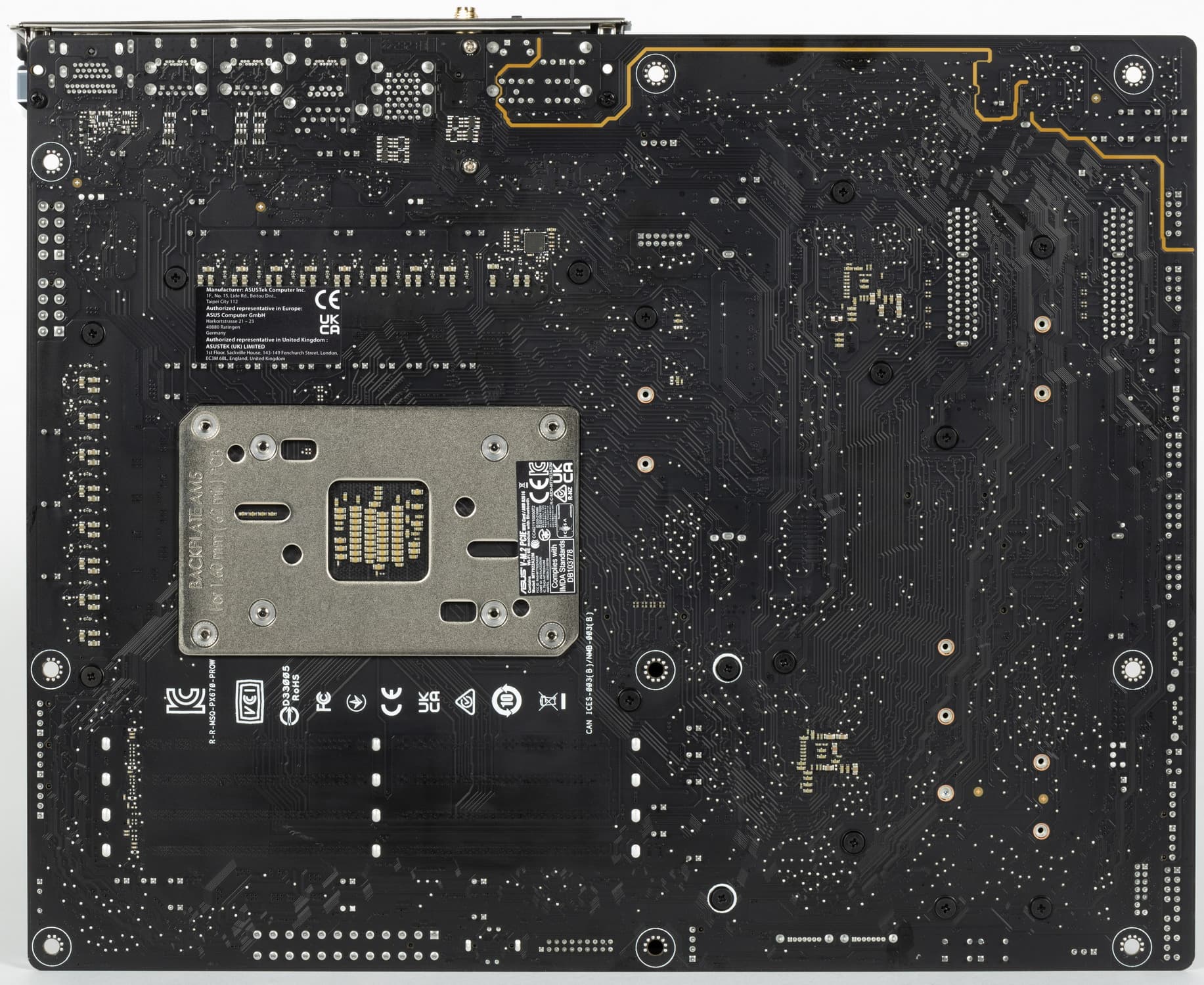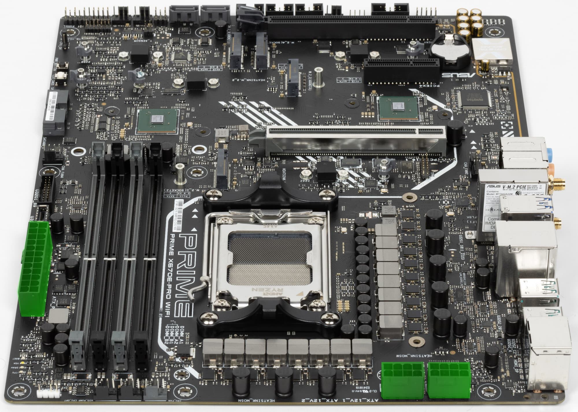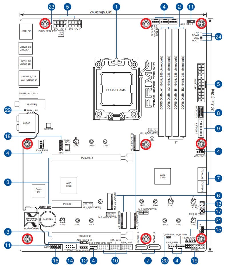 Форм-фактор ATX имеет размеры до 305×244 мм, а E-ATX — до 305×330 мм. Материнская плата Asus Prime X670E-Pro WiFi имеет размеры 305×244 мм, поэтому выполнена в форм-факторе ATX, и на ней имеются 9 монтажных отверстий для установки в корпус.