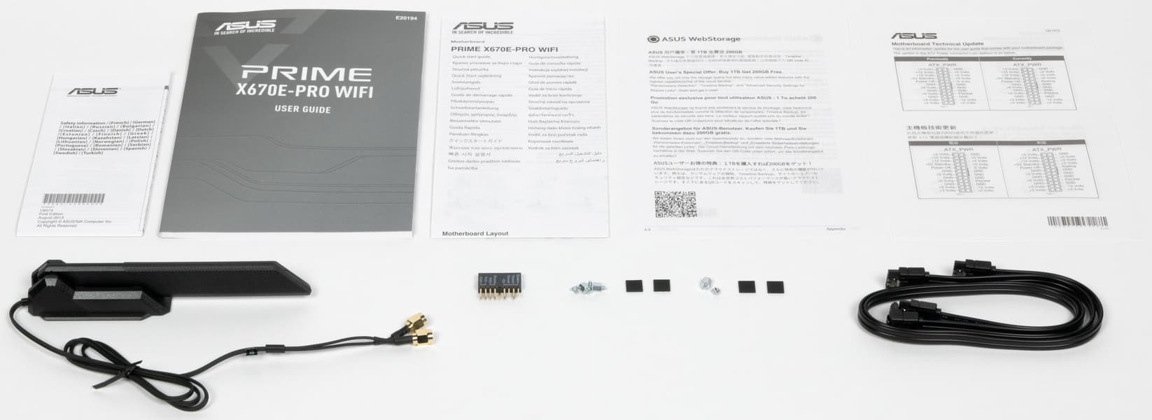 Asus Prime X670E-Pro WiFi поставляется в традиционной коробке фирменного дизайна в серых тонах серии Prime. Комплект размещен под платой в отдельном отсеке.
