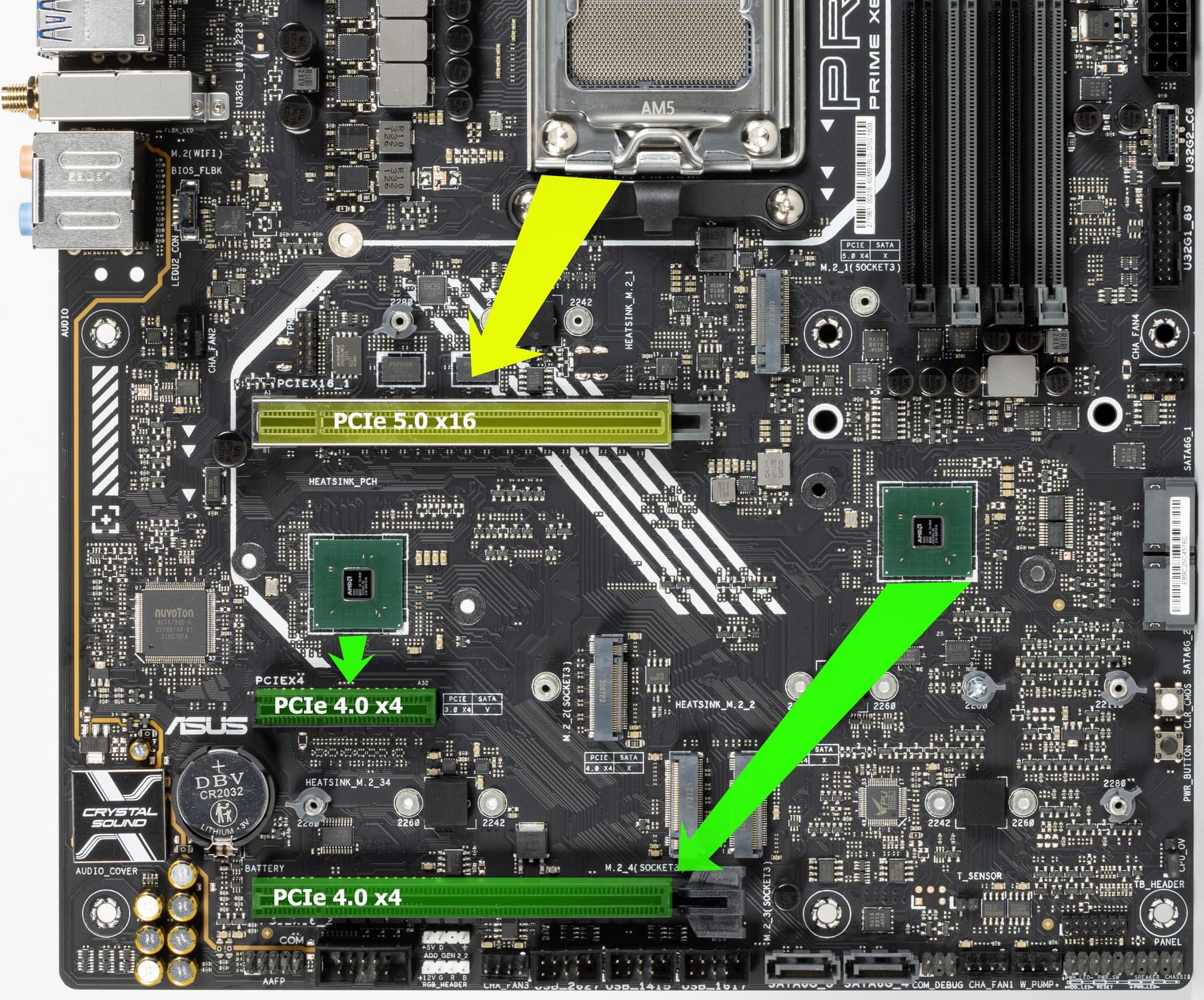 Теперь посмотрим выше на то, как работают процессоры в данной конфигурации. У всех Ryzen 7xxx/8xxx/9xxx — 24 линии PCIe (плюс 4 линии на даунлинк с чипсетом). Смотрим распределение:
