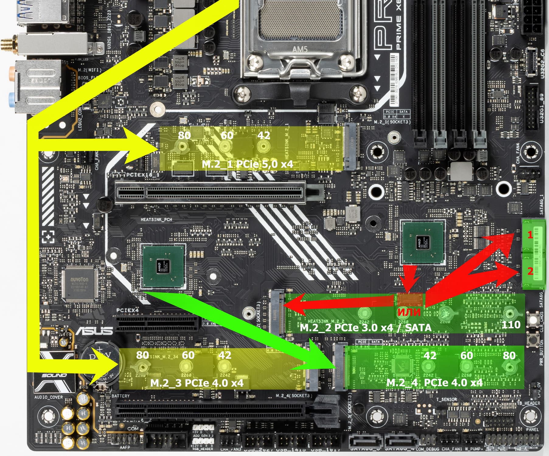 - Переключатель: или слот M.2_2 (4 линии PCIe 3.0), или порты SATA 1,2 (2 линии PCIe 3.0) (максимум 4 линии PCIe 3.0);