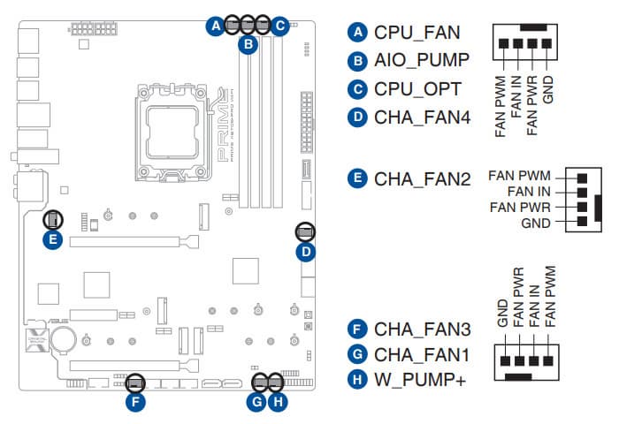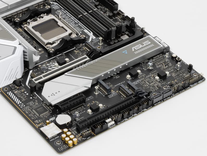 Есть 4 слота M.2: два из них подключены напрямую к процессору линиями PCIe 5.0 и PCIe 4.0, два других подключены к чипсету X670E линиями PCIe 4.0 и PCIe 3.0. В арсенале платы также есть 4 порта SATA и 8 разъемов для вентиляторов. Один из чипсетных слотов M.2 делит ресурсы с двумя портами SATA.