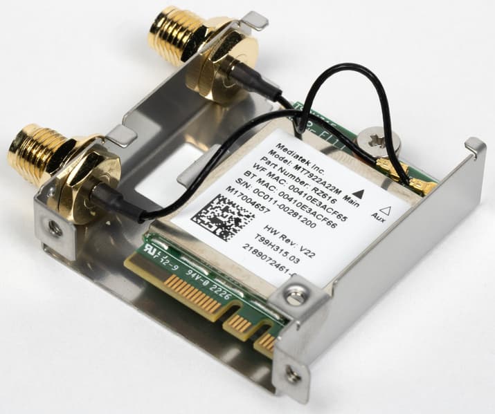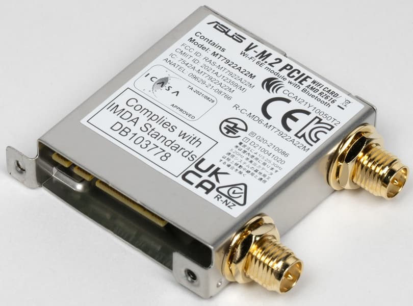 Имеется и комплексный беспроводной адаптер на контроллере MediaTek MT7922 (AMD RZ616), через который реализованы Wi-Fi 6E (802.11a/b/g/n/ac/ax) и Bluetooth 5.3. Он установлен в слот M.2 (E-key), и его разъемы для привинчивания выносных антенн выведены на заднюю панель.
