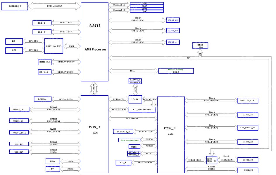 Плюс 20 линий PCIe, выделенные на поддержку иной периферии. Итого, у X670E в данном случае реализовано 30 высокоскоростных портов.