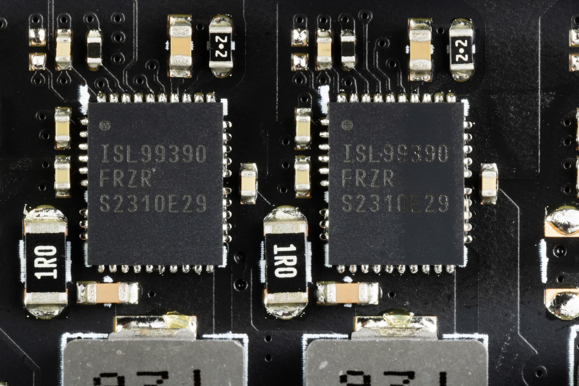 Каждый канал фазы VCore и встроенной графики имеет суперферритовый дроссель и транзисторную сборку ISL99390 от Renesas (до 90A).