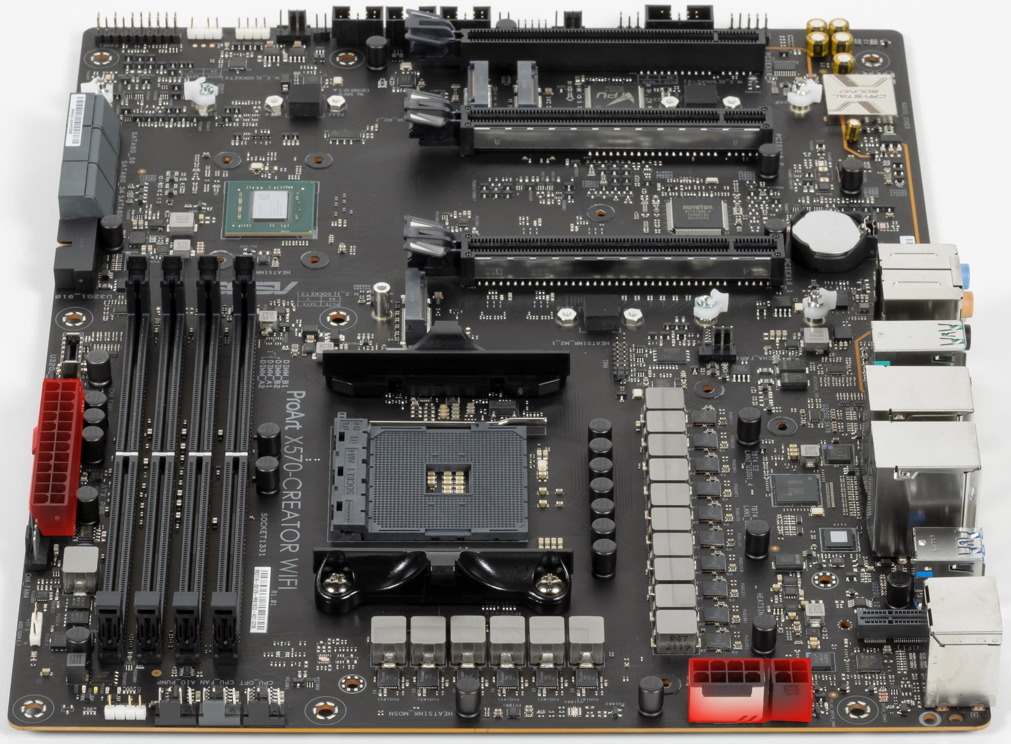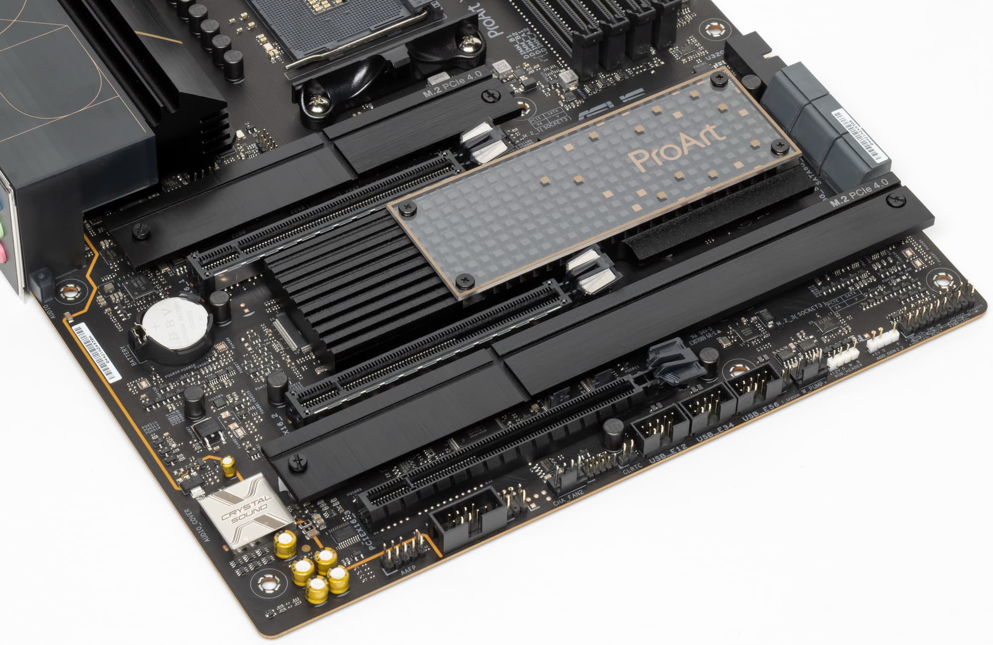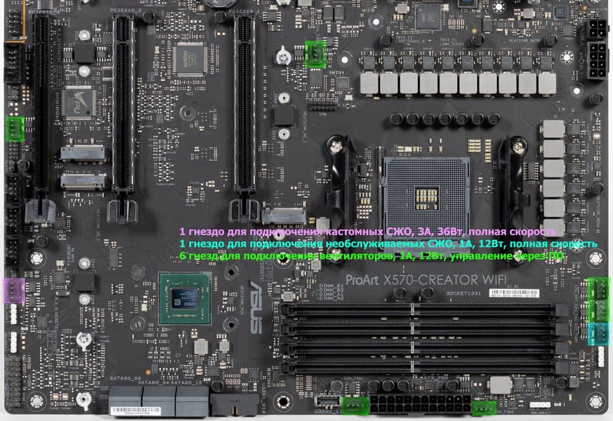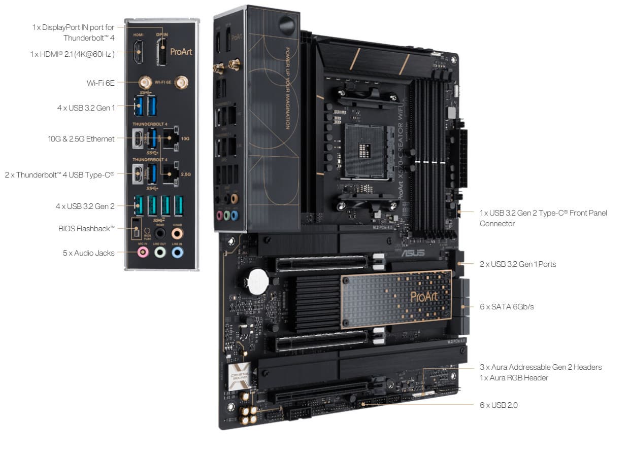 У Asus ProArt X570-Creator WiFi имеется 19 портов USB разных видов, включая 7 очень быстрых USB 3.2 Gen2, два из которых поддерживают Thunderbolt 4. Плата предлагает 2 слота PCIe х16 (они получают от процессора 16 линий PCIe), слот PCIe x4, 3 слота M.2 (один из них подключен напрямую к процессору линиями PCIe 4.0, еще один также может подключаться к процессору, но для этого придется уменьшить количество линий PCIe для слотов PCIe x16).