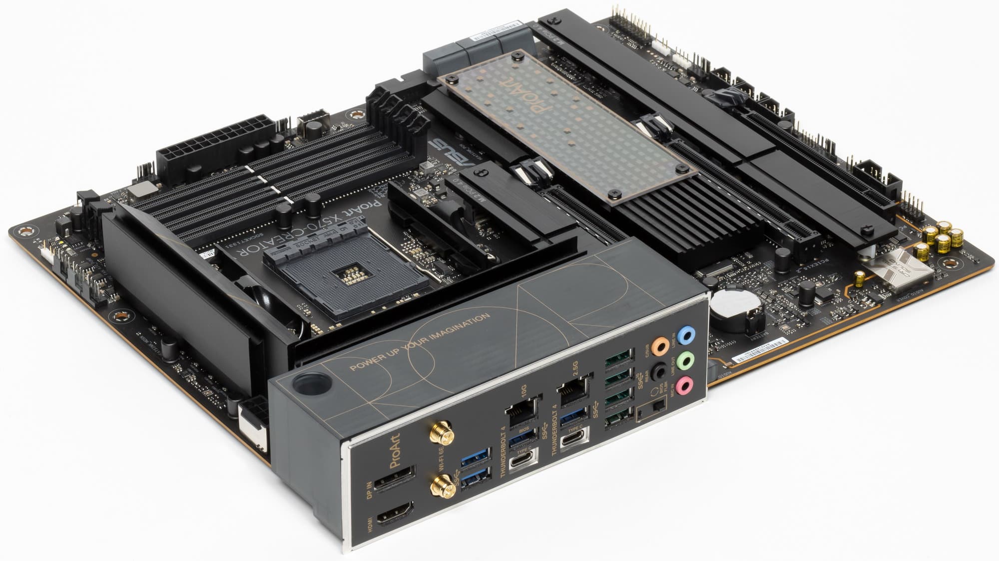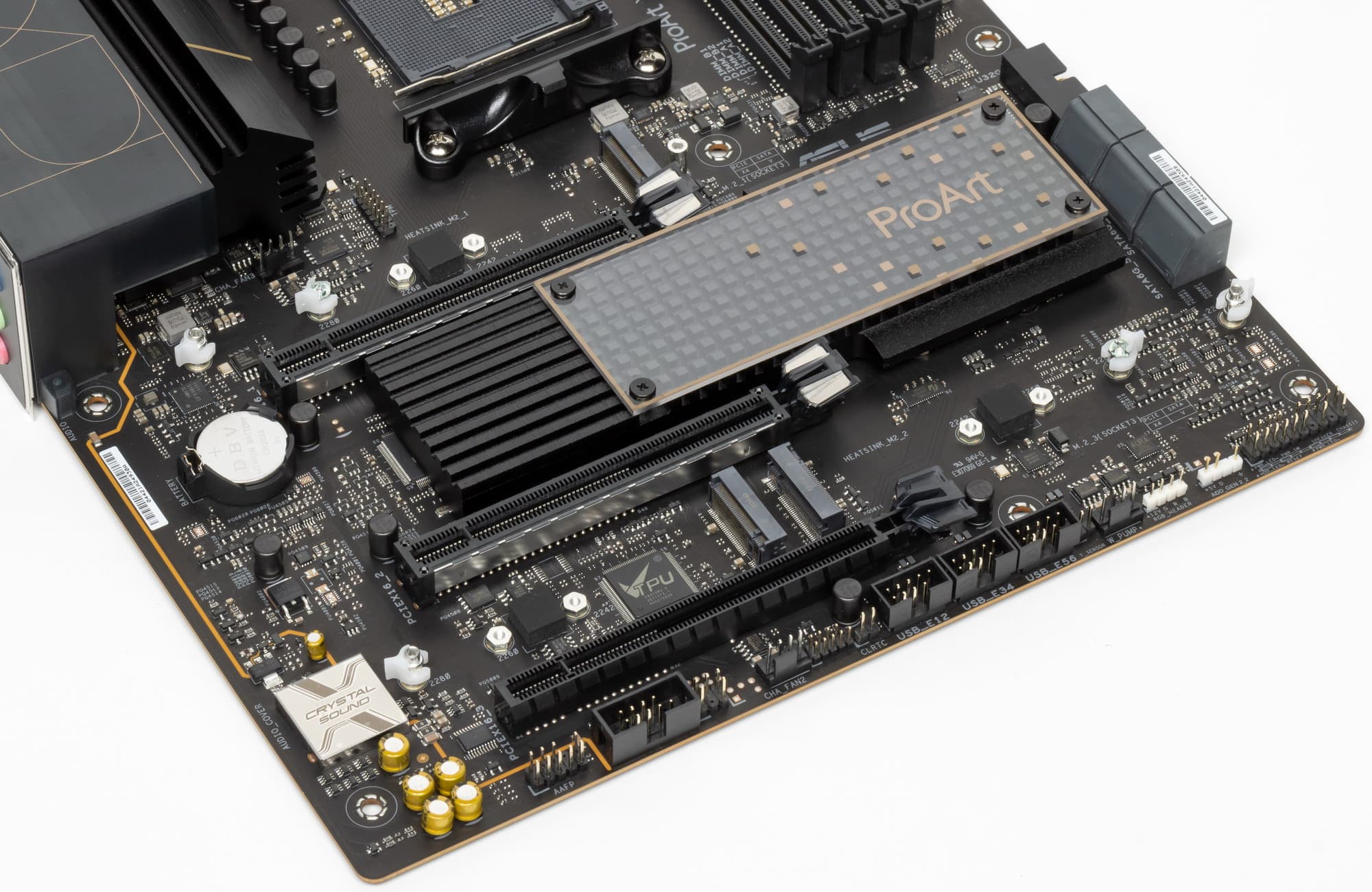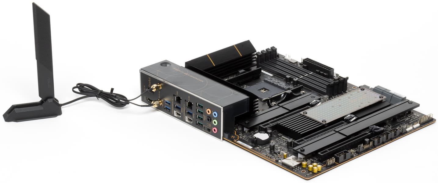 У Asus ProArt X570-Creator WiFi имеется 19 портов USB разных видов, включая 7 очень быстрых USB 3.2 Gen2, два из которых поддерживают Thunderbolt 4. Плата предлагает 2 слота PCIe х16 (они получают от процессора 16 линий PCIe), слот PCIe x4, 3 слота M.2 (один из них подключен напрямую к процессору линиями PCIe 4.0, еще один также может подключаться к процессору, но для этого придется уменьшить количество линий PCIe для слотов PCIe x16).
