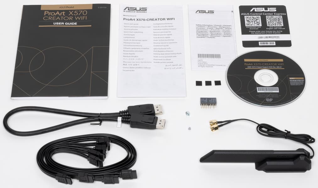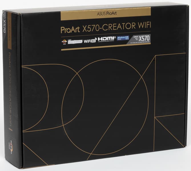 Asus ProArt X570-Creator WiFi поставляется в стандартного размера коробке без излишеств и наворотов. Дизайн строгий и вместе с тем стильный. Комплект размещен под платой в отдельных отсеках.