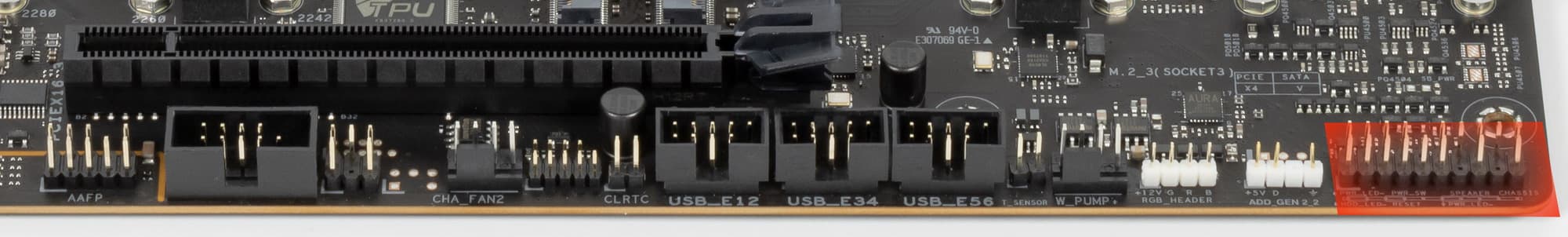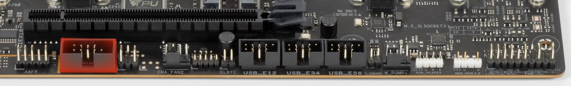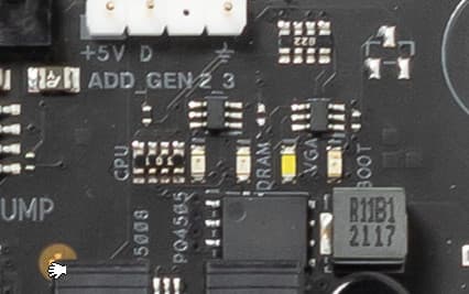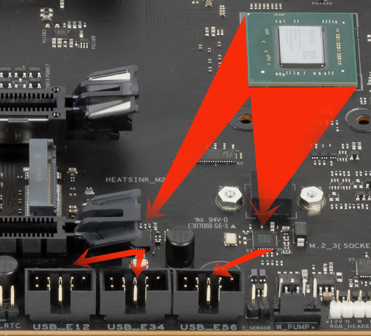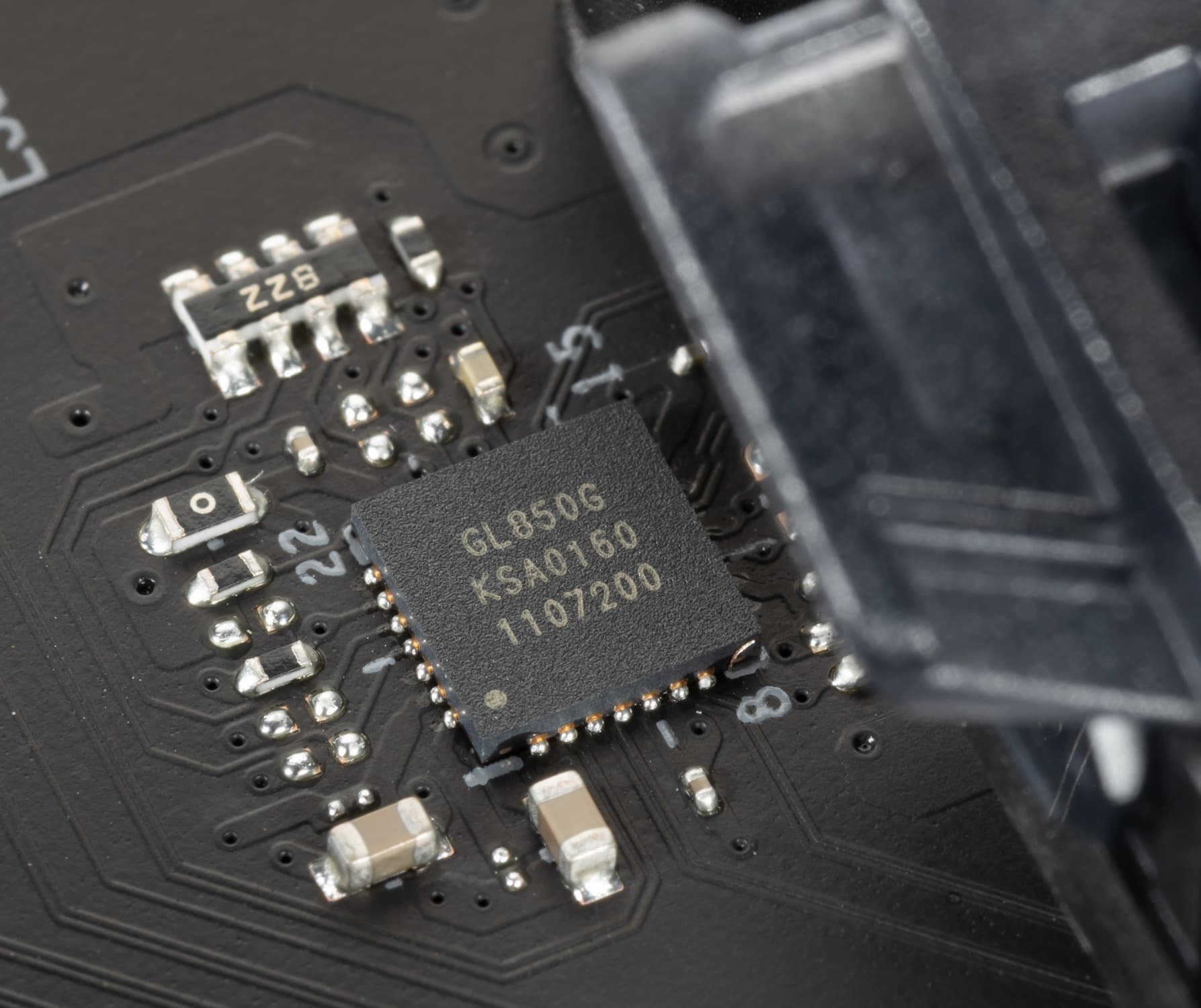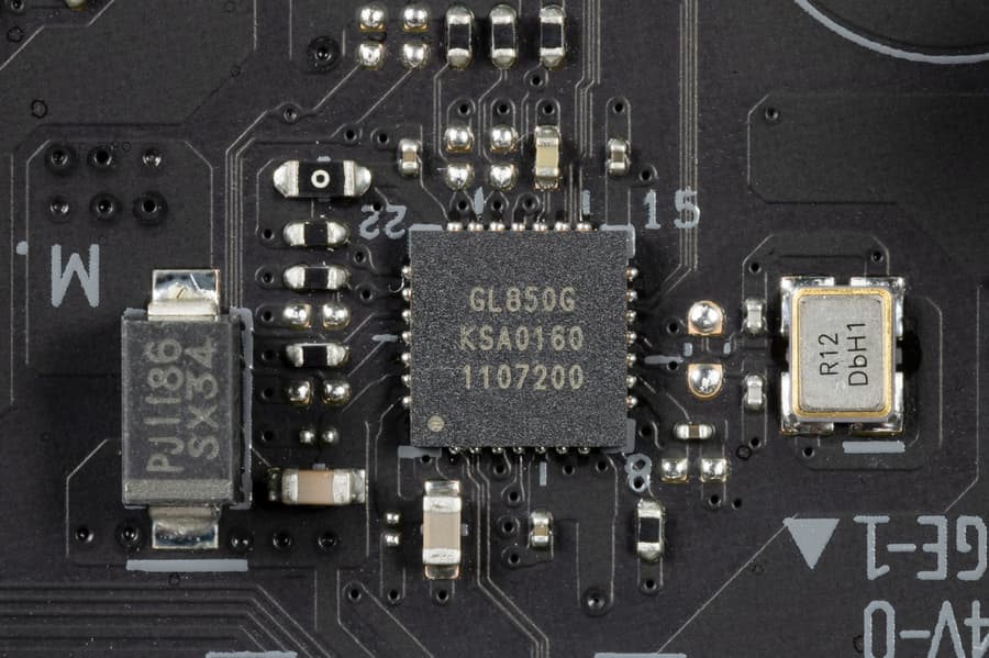 - 6 портов USB 2.0/1.1: все реализованы через два контроллера Genesys Logic GL850G (на каждый из них потрачена 1 линия USB 2.0 от X570) и представлены тремя внутренними разъемами (каждый на 2 порта).