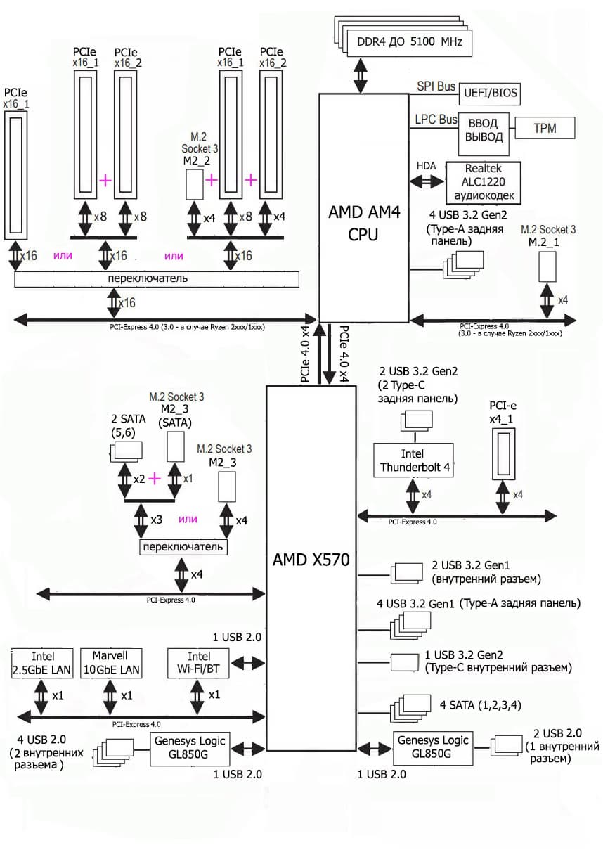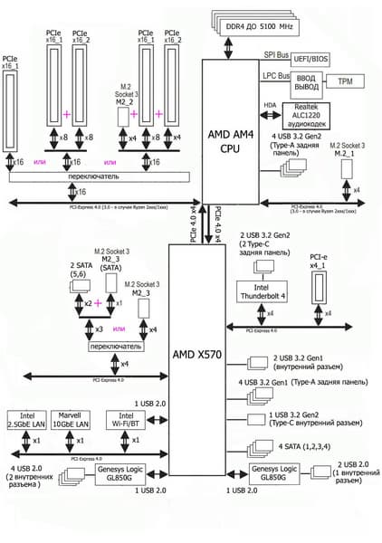 Процессоры Ryzen 3000/5000 поддерживают 4 порта USB 3,2 Gen2, 24 линии ввода-вывода (включая PCI-E 4.0), но 4 линии из них идут на взаимодействие с X570, еще 16 линий — это PCI-E слоты для видеокарт. Осталось 4 линии: они могут конфигурироваться производителями материнских плат на выбор (либо-либо):