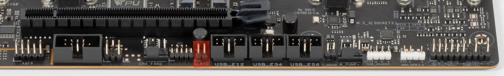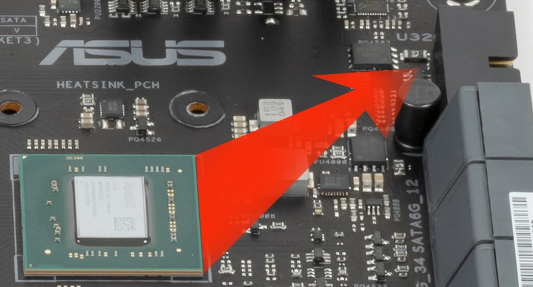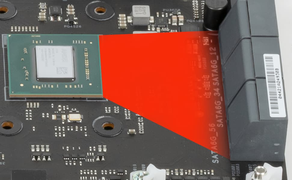- Переключатель: или накопитель в слоту M.2_3 с интерфейсом SATA (1 линия) плюс порты SATA 5,6 (2 линии), или накопитель в слоту М.2_3 с интерфейсом PCIe (4 линии), тогда SATA 5,6 отключены (максимум 4 линии);