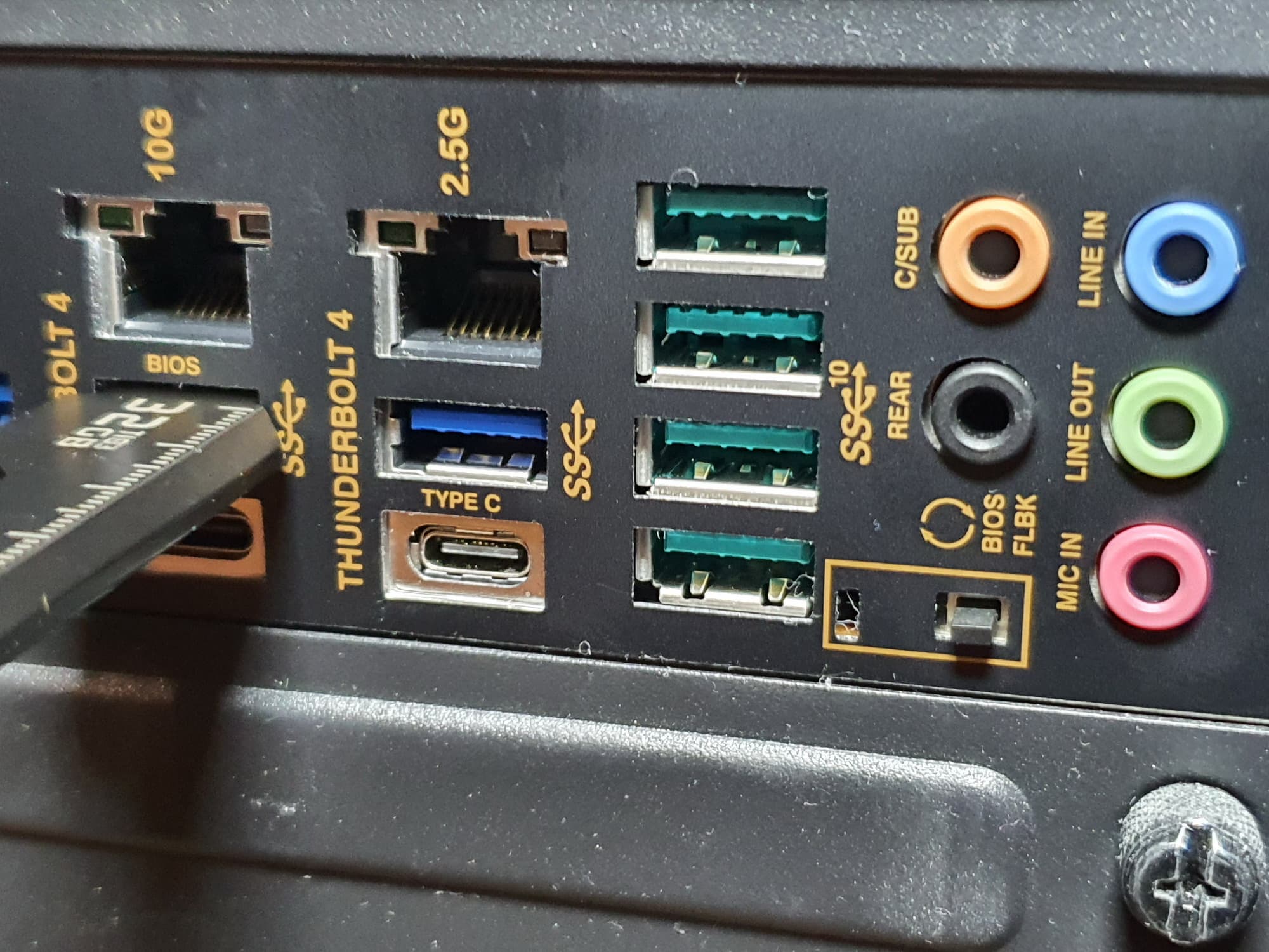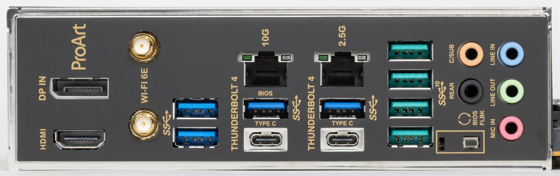 - 7 портов USB 3.2 Gen2: 4 реализованы через процессор представлены на задней панели портами Type-A (голубые); один реализован через X570 и представлен внутренним портом Type-C для подключения к соответствующему разъему на передней панели корпуса; оставшиеся 2 реализованы через Intel Thunderbolt 4 и представлены двумя портами Type-C на задней панели;