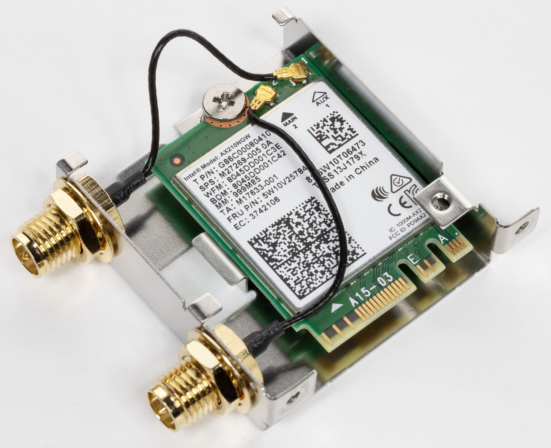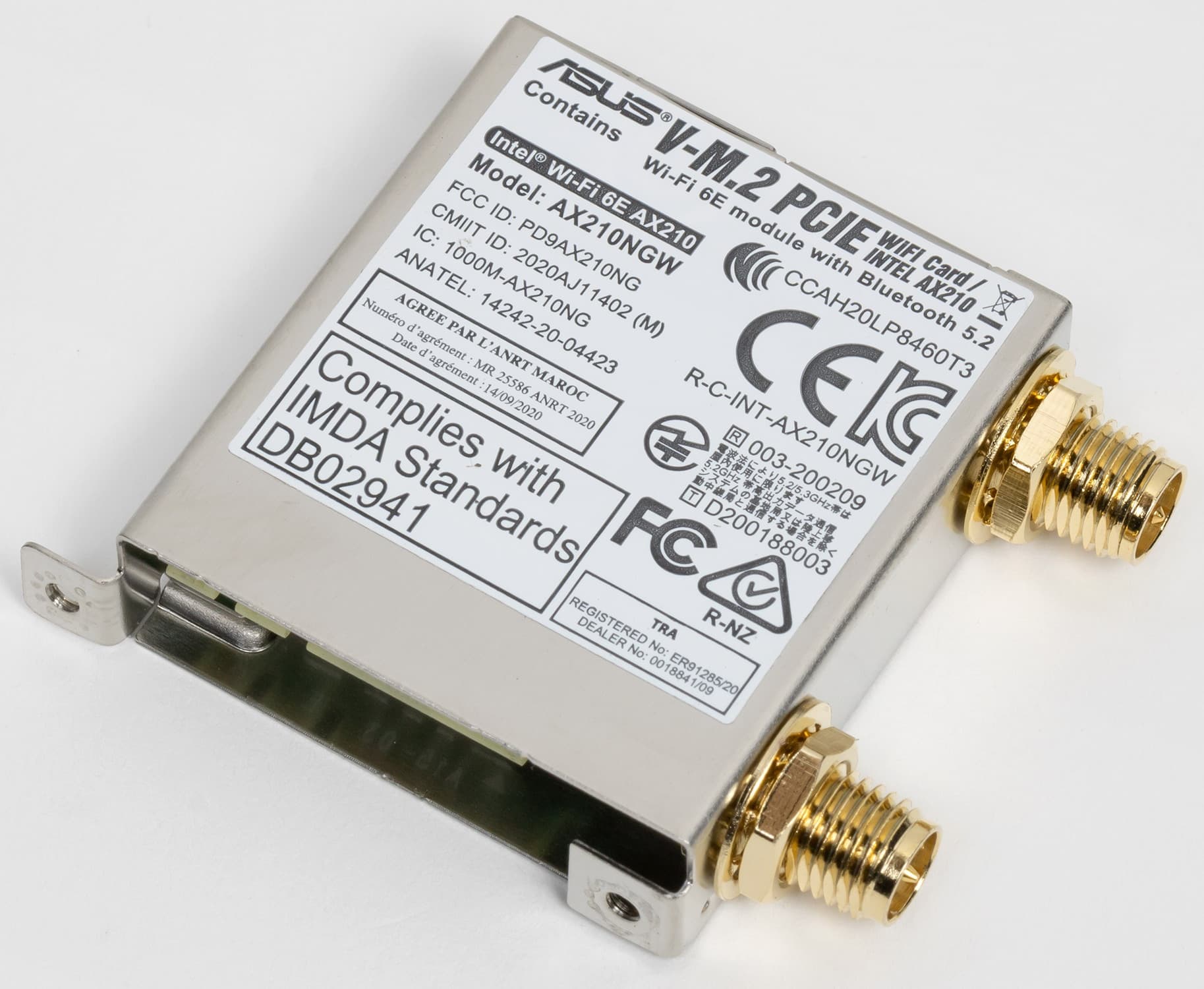 Имеется и комплексный беспроводной адаптер на контроллере Intel AX-210NGW, через который реализованы Wi-Fi 6E (802.11a/b/g/n/ac/ax) и Bluetooth 5.2. Он установлен в слот M.2 (E-key), и его разъемы для привинчивания выносных антенн выведены на заднюю панель.