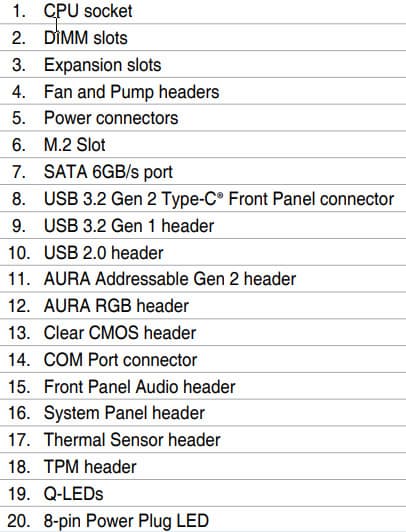 | Прочие внутренние элементы | 24-контактный разъем питания ATX 1 8-контактный разъем питания EPS12V 1 4-контактный разъем питания EPS12V 1 слот M.2 (E-key), занят адаптером беспроводных сетей 1 разъем для подключения порта USB 3.2 Gen2 Type-C 1 разъем для подключения 2 портов USB 3.2 Gen1 3 разъема для подключения 6 портов USB 2.0 8 разъемов для подключения 4-контактных вентиляторов и помп ЖСО 1 разъем для подключения неадресуемой RGB-ленты 3 разъема для подключения адресуемой ARGB-ленты 1 разъем аудио для передней панели корпуса 1 разъем для сброса CMOS 1 разъем для термодатчикa 1 разъем подключения COM-порта 2 разъема для подключения управления с передней панели корпуса 1 разъем подключения TPM |