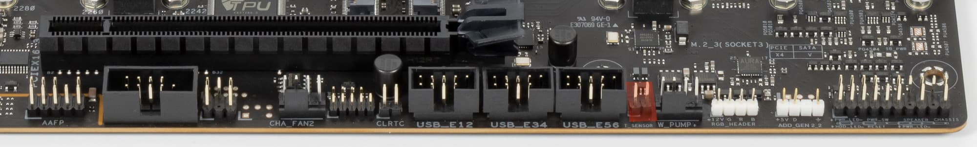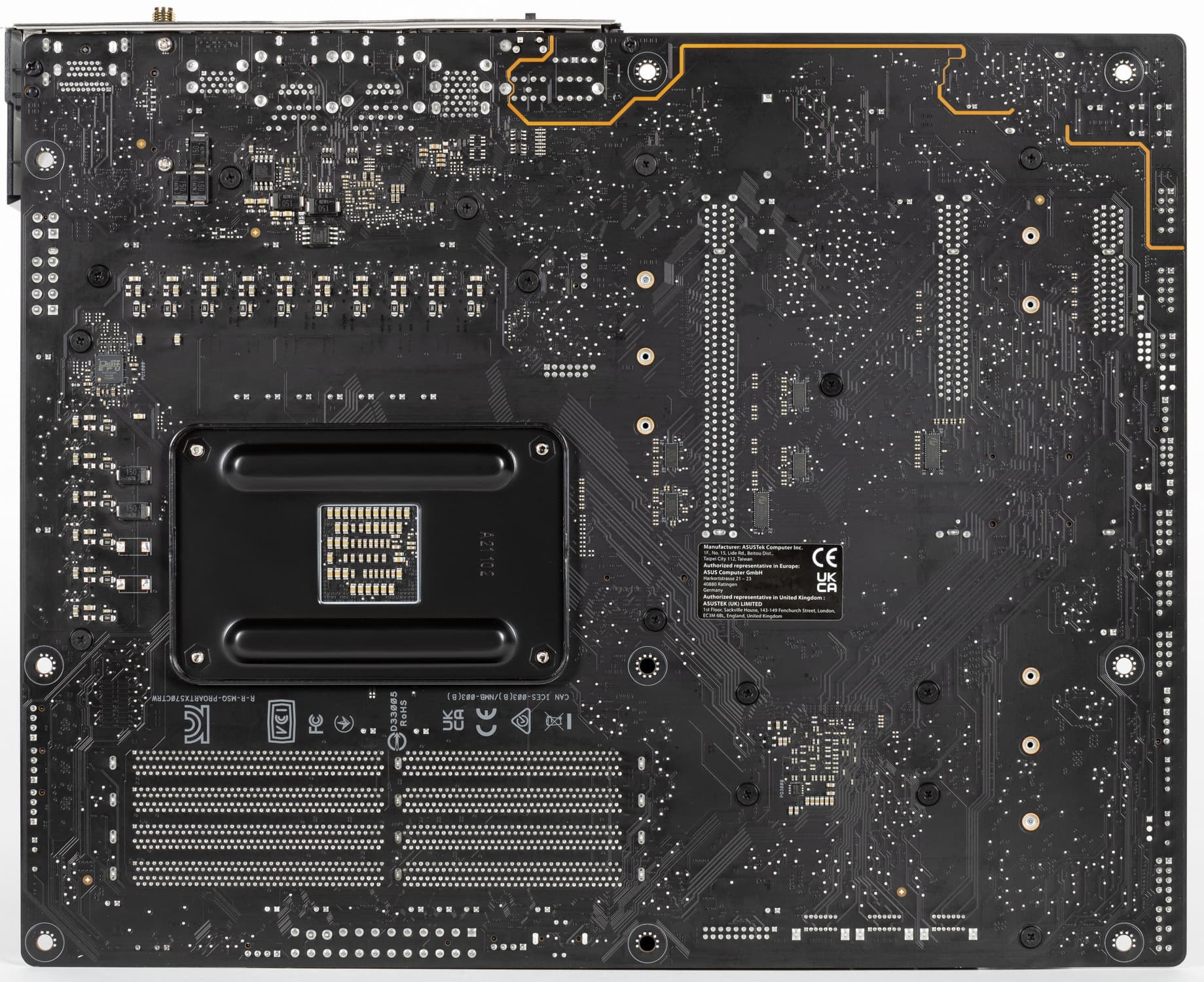 В арсенале платы есть 6 портов SATA и 8 разъемов для вентиляторов. Несмотря на то что эта модель не относится к семейству ROG, система питания процессора очень мощная, способная обеспечить работу любых совместимых процессоров с приличным запасом на разгон. Плата имеет эффективную систему охлаждения каждого потенциально греющегося элемента, включая накопители в слотах M.2. Стоит отметить и отличные сетевые возможности: два проводных скоростных контроллера 2,5 и 10 Гбит/с, а также один самый современный беспроводной. Поддержка Thunderbolt 4 позволяет передавать данные на скорости 40 Гбит/с, также имеется возможность выводить картинку на приемник с интерфейсом Thunderbolt 4. По поводу подсветки можно сказать, что плата поддерживает подключение разных современных наборов ARGB/RGB, но сама по себе лишена подсветки.