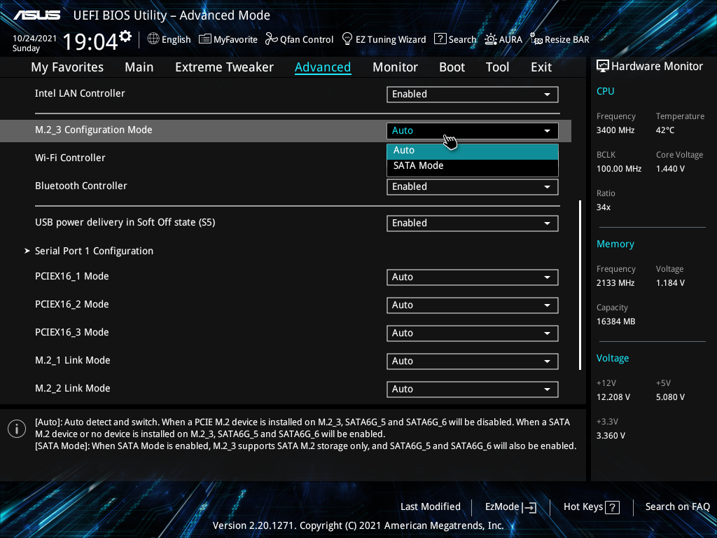 Теперь посмотрим выше на то, как работают процессоры в данной конфигурации. У всех Ryzen — 20 линий PCIe (плюс 4 линии на даунлинк с чипсетом). 4 линии уходят на слот M.2_1, а остальные 16 линий надо делить на два слота PCIe x16 (_1 и _2), а также на порт М2_3 (который также «питается данными» от процессора). Вариантов переключения несколько: