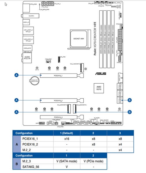 Два М.2 (M.2_1, M.2_2) получают данные от от CPU, при этом М.2_1 поддерживает модули с любым интерфейсом и размерами 2242/2260/2280/22110. М.2_2 работает с модулями только с PCIe интерфейсом и размерами 2242/2260/2280. М.2_3 подключен к X570, поддерживает модули с любым интерфейсом и размерами 2242/2260/2280/22110 (помним, что он делит ресурсы с SATA 5,6).