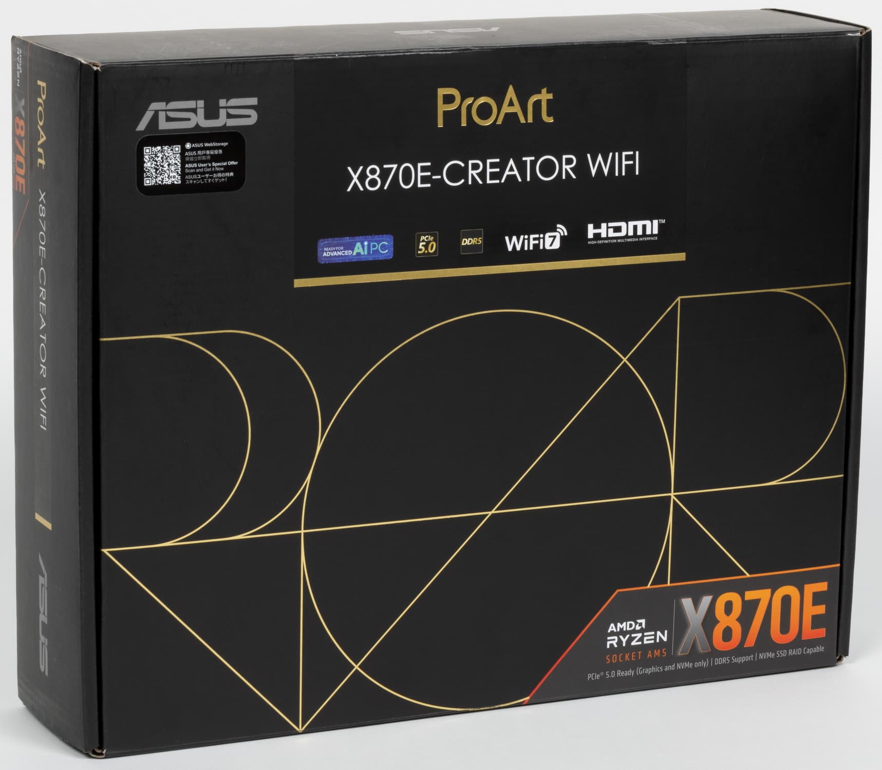 Asus ProArt X870E-Creator WiFi поставляется в традиционной коробке фирменного дизайна серии. Комплект размещен под платой в отдельном отсеке.