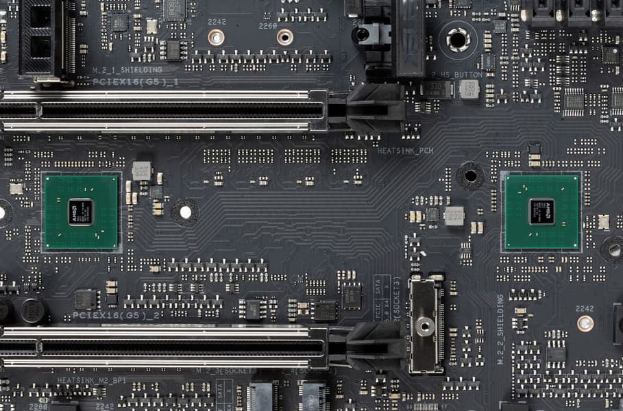 Всего на плате есть 3 слота: два PCIe x16_1/2 (для видеокарт или других устройств) и один PCIe x16_3, работающий в режиме х4. Если про первые два PCIe x16 я выше уже рассказал (они подключены к CPU), то PCIe x16_3 подключен к X870E.
