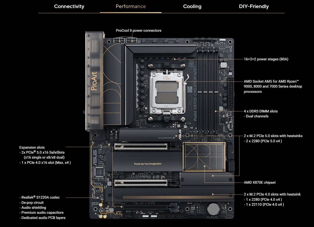 Выше мы изучили потенциальные возможности тандема X870E+Ryzen, а теперь посмотрим, что из этого и как реализовано в данной материнской плате.