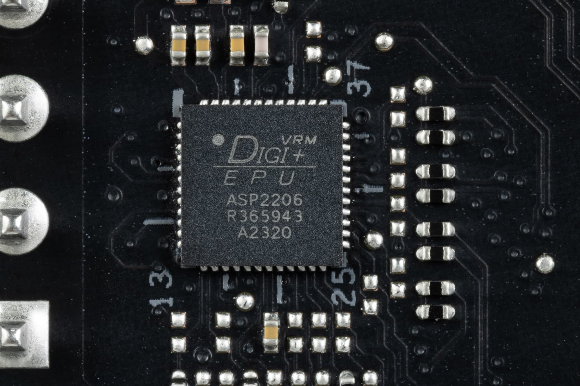 Управляет обоими наборами фаз (18+2) фирменный ШИМ-контроллер Digi+ ASP2206.