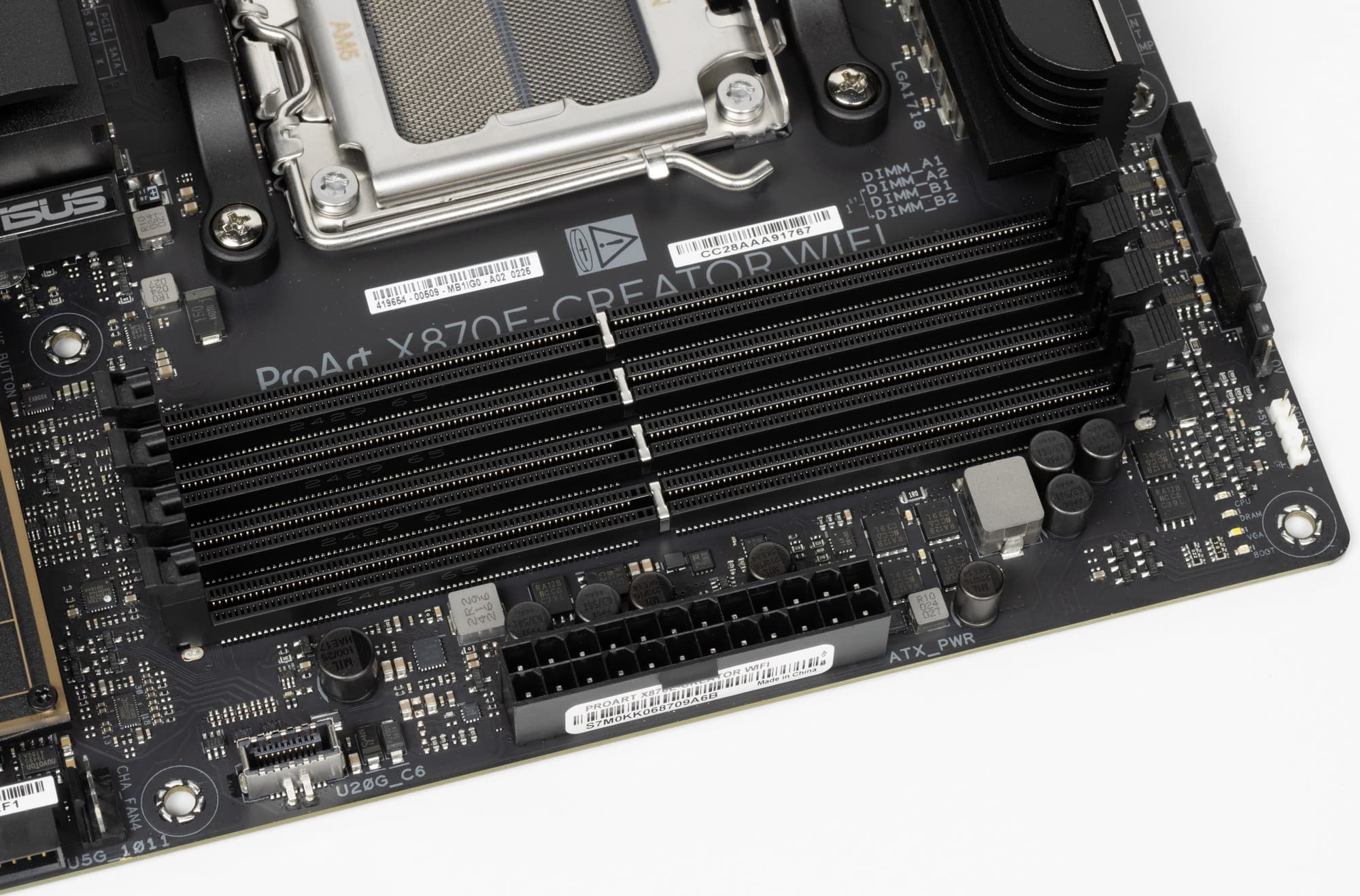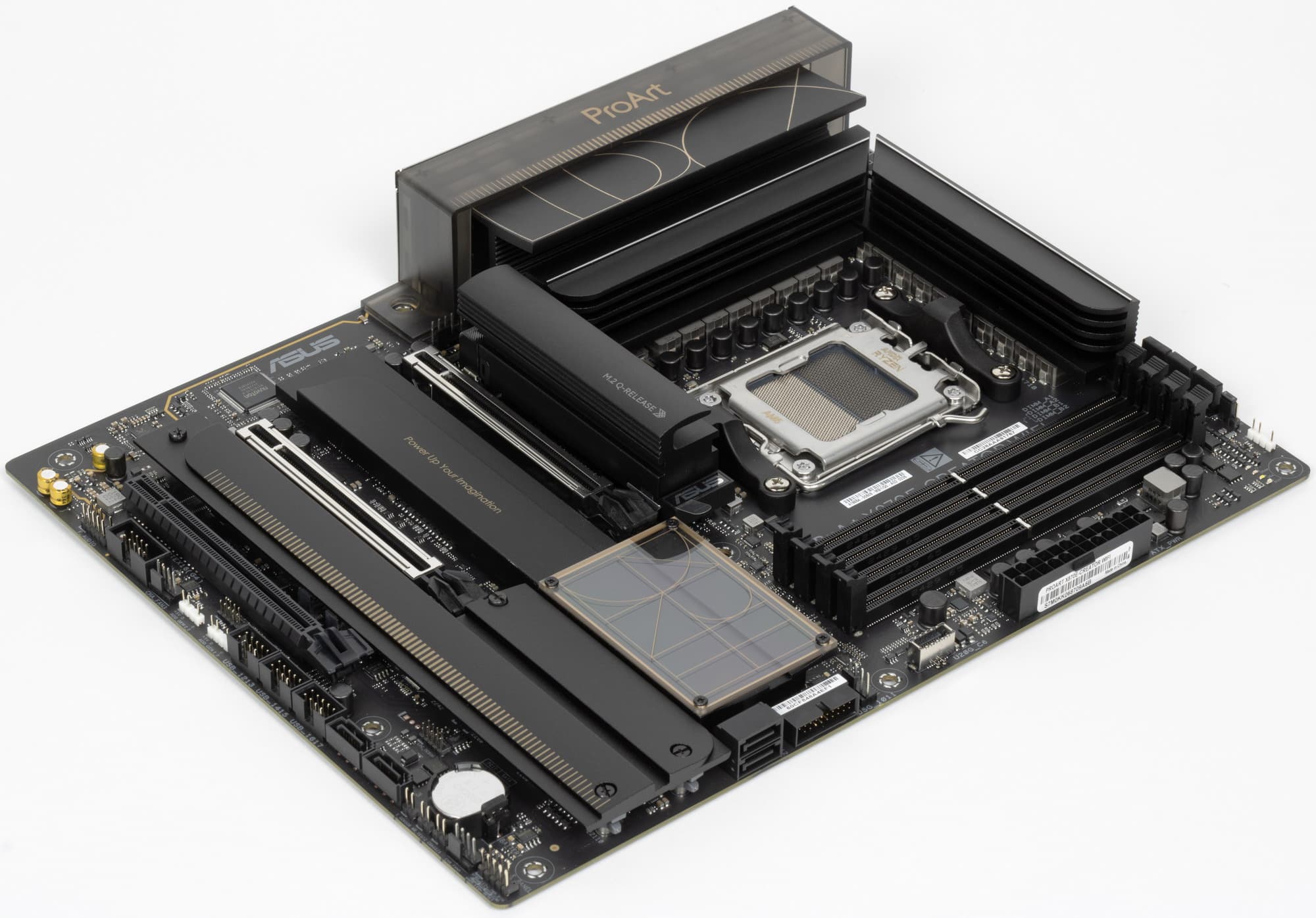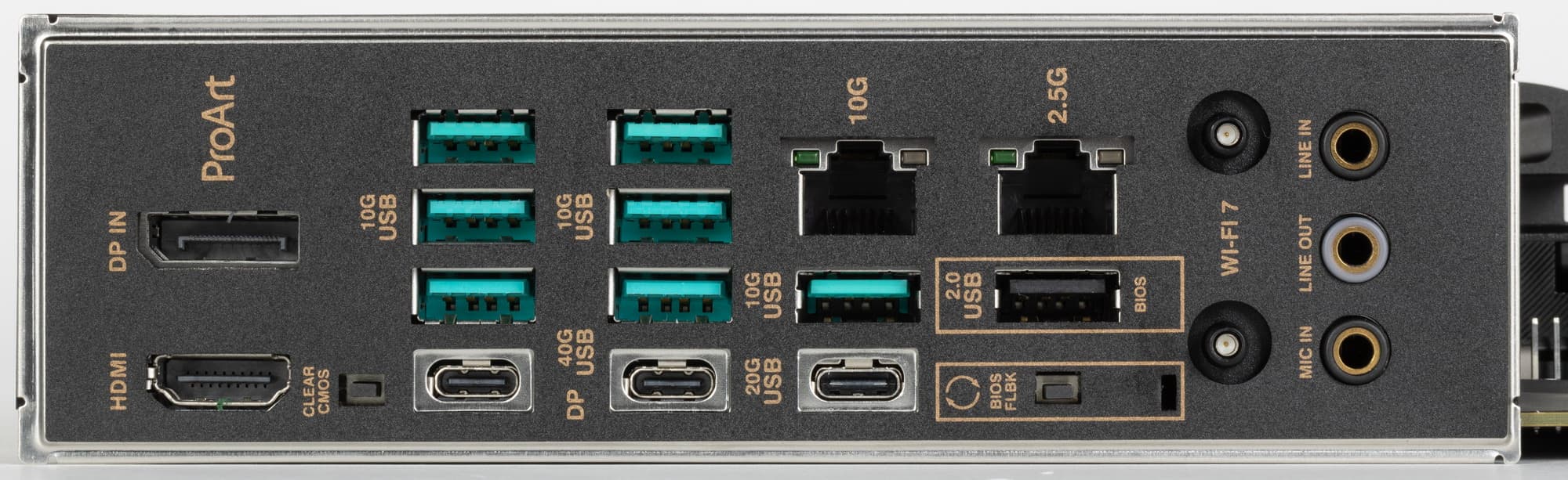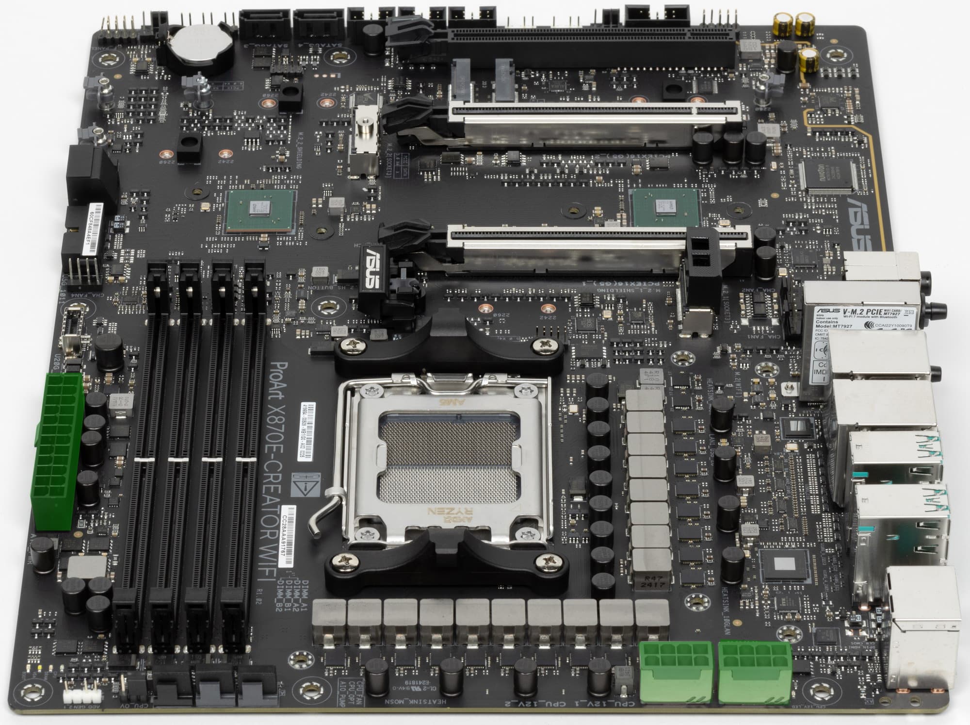 У Asus ProArt X870E-Creator WiFi имеется 20 портов USB разных видов, включая 2 самых современных USB4 (40 Гбит/с), 7 портов USB 3.2 Gen2, а также два USB 3.2 Gen2×2 в виде внутреннего и обычного портов Type-C. Плата предлагает 2 слота PCIe х16, которые получают от процессора 16 линий PCIe версии 5.0 (и делят их со вторым слотом M.2, подключенным к процессору), также имеется слот формата PCIe x16, соединенный с чипсетом 4 линиями PCIe 4.0. Всего у платы 4 слота M.2: два из них подключены напрямую к процессору линиями PCIe 5.0, два других подключены к чипсету X870E линиями PCIe 4.0. Также в арсенале платы есть 4 порта SATA и 8 разъемов для вентиляторов. Система питания процессора очень мощная, она способна обеспечить работу любых совместимых процессоров с приличным запасом на разгон. Плата имеет грамотную систему охлаждения каждого потенциально греющегося элемента, включая накопители в слотах M.2.