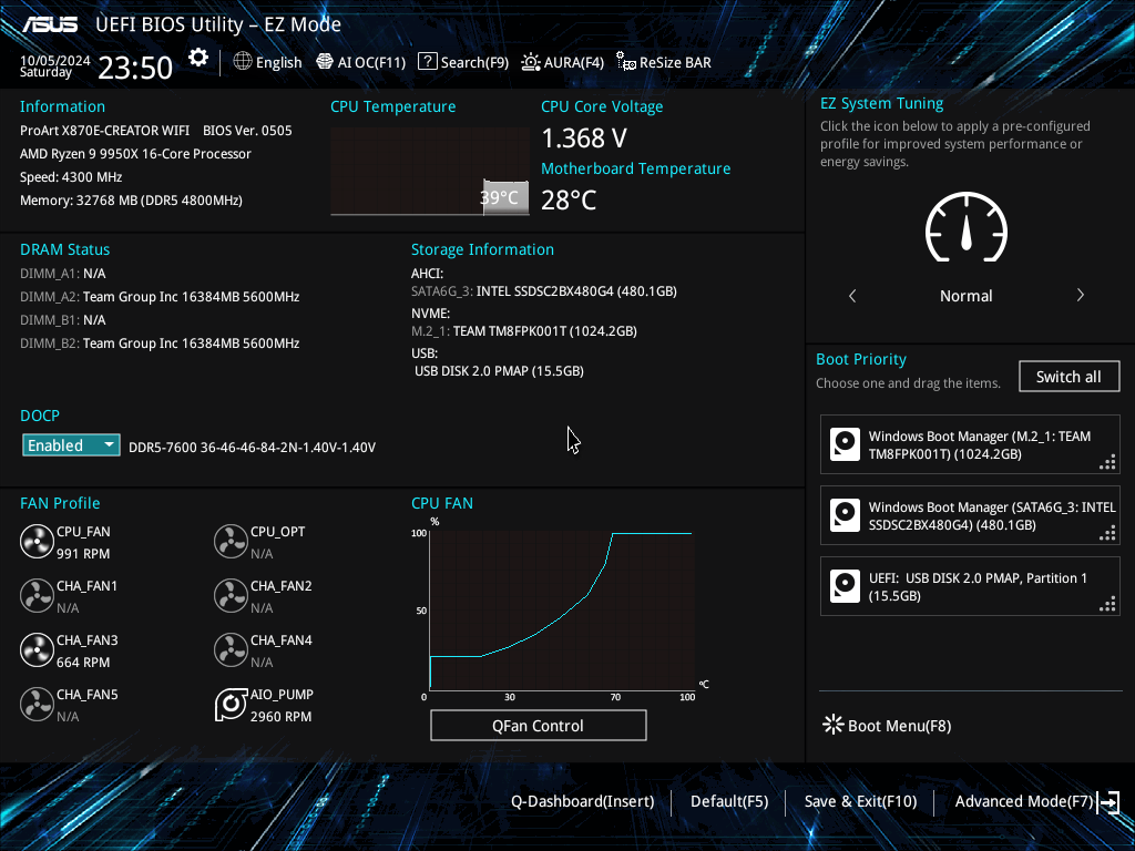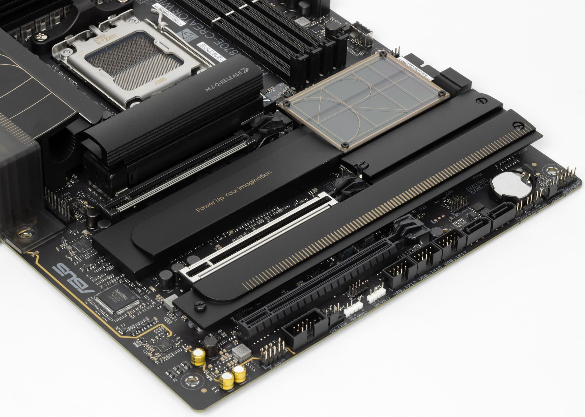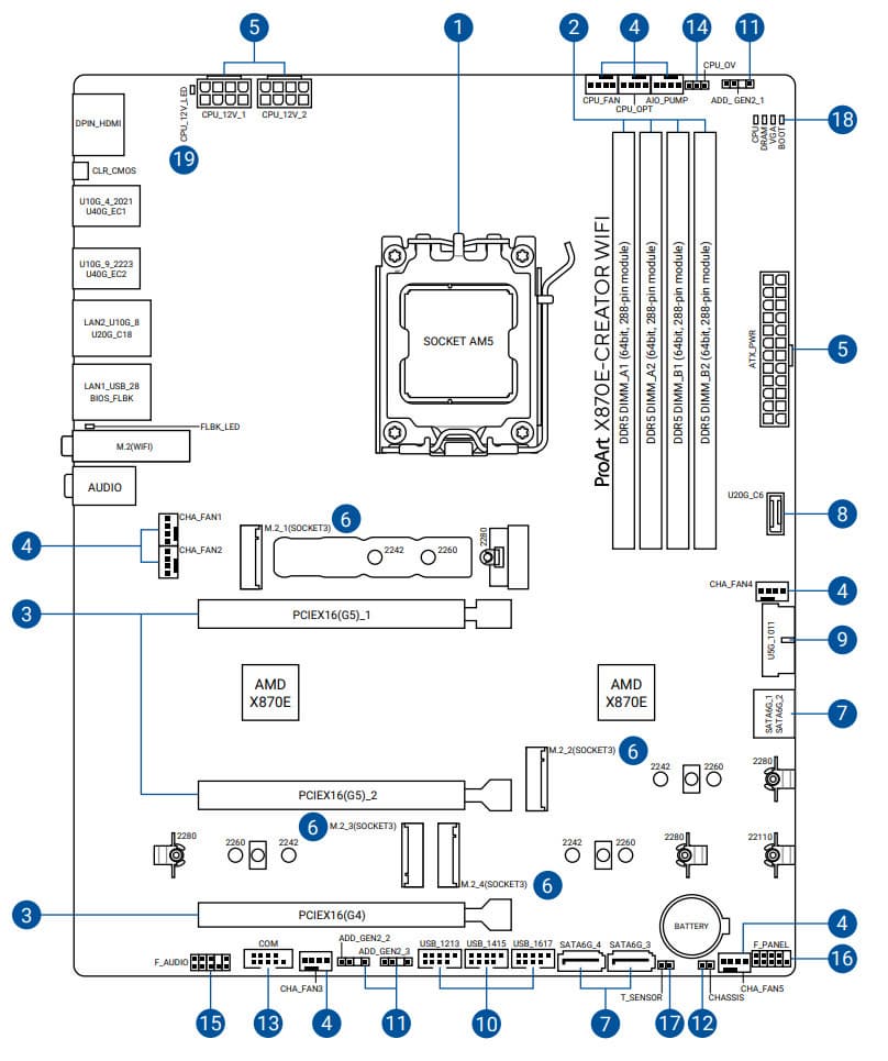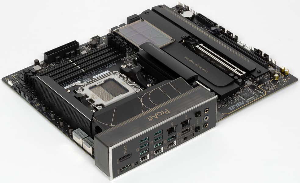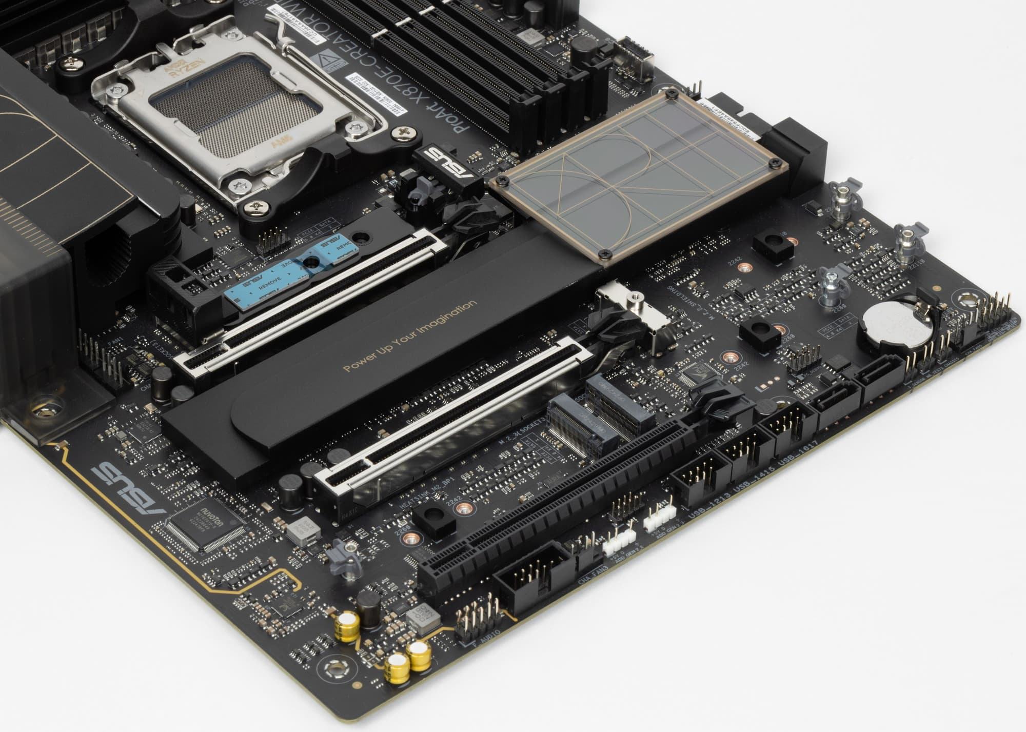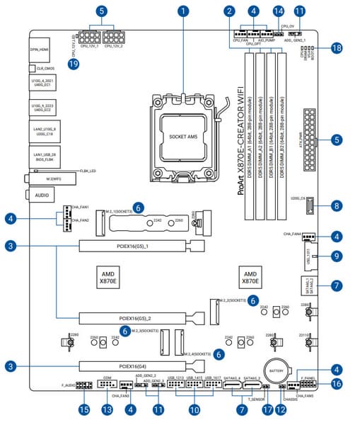 У Asus ProArt X870E-Creator WiFi имеется 20 портов USB разных видов, включая 2 самых современных USB4 (40 Гбит/с), 7 портов USB 3.2 Gen2, а также два USB 3.2 Gen2×2 в виде внутреннего и обычного портов Type-C. Плата предлагает 2 слота PCIe х16, которые получают от процессора 16 линий PCIe версии 5.0 (и делят их со вторым слотом M.2, подключенным к процессору), также имеется слот формата PCIe x16, соединенный с чипсетом 4 линиями PCIe 4.0. Всего у платы 4 слота M.2: два из них подключены напрямую к процессору линиями PCIe 5.0, два других подключены к чипсету X870E линиями PCIe 4.0. Также в арсенале платы есть 4 порта SATA и 8 разъемов для вентиляторов. Система питания процессора очень мощная, она способна обеспечить работу любых совместимых процессоров с приличным запасом на разгон. Плата имеет грамотную систему охлаждения каждого потенциально греющегося элемента, включая накопители в слотах M.2.