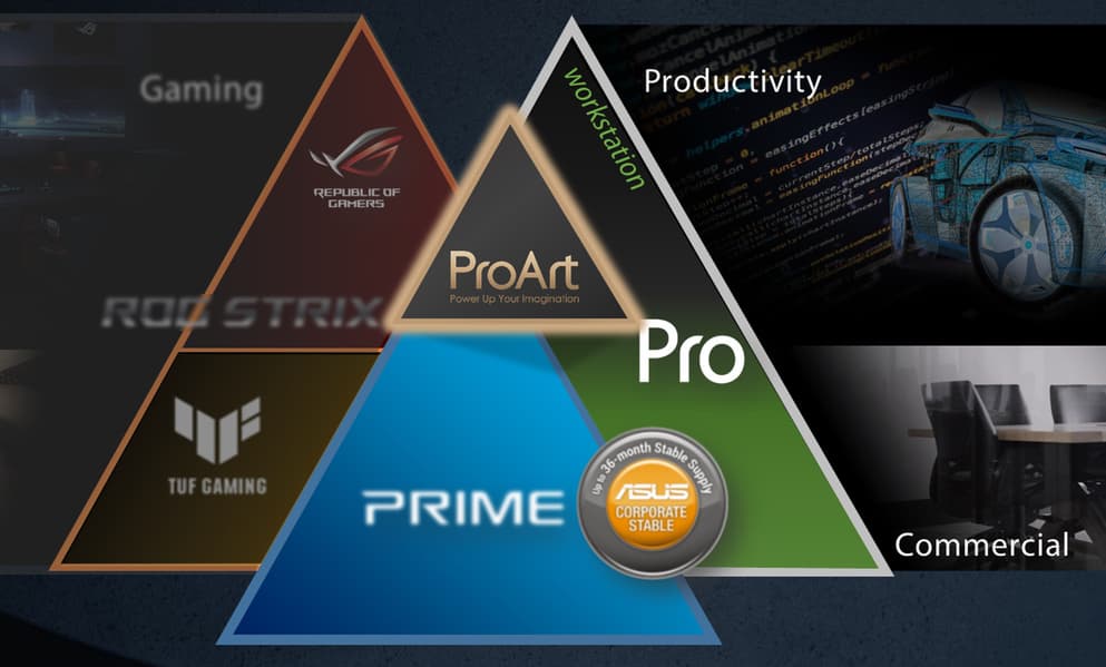 Первой материнской платой, основанной на AMD X870E, стал продукт из серии ProArt. Вообще, я скажу, что у компании Asus весьма сложное и вероятно понятное только их собственным маркетологам деление по сериям всего ассортимента материнок. Даже в их собственной диаграмме треугольники продуктовых серий частично перекрывают друг друга, то есть много моделей, которые по сути можно отнести к любой из ниже приведенных серий.