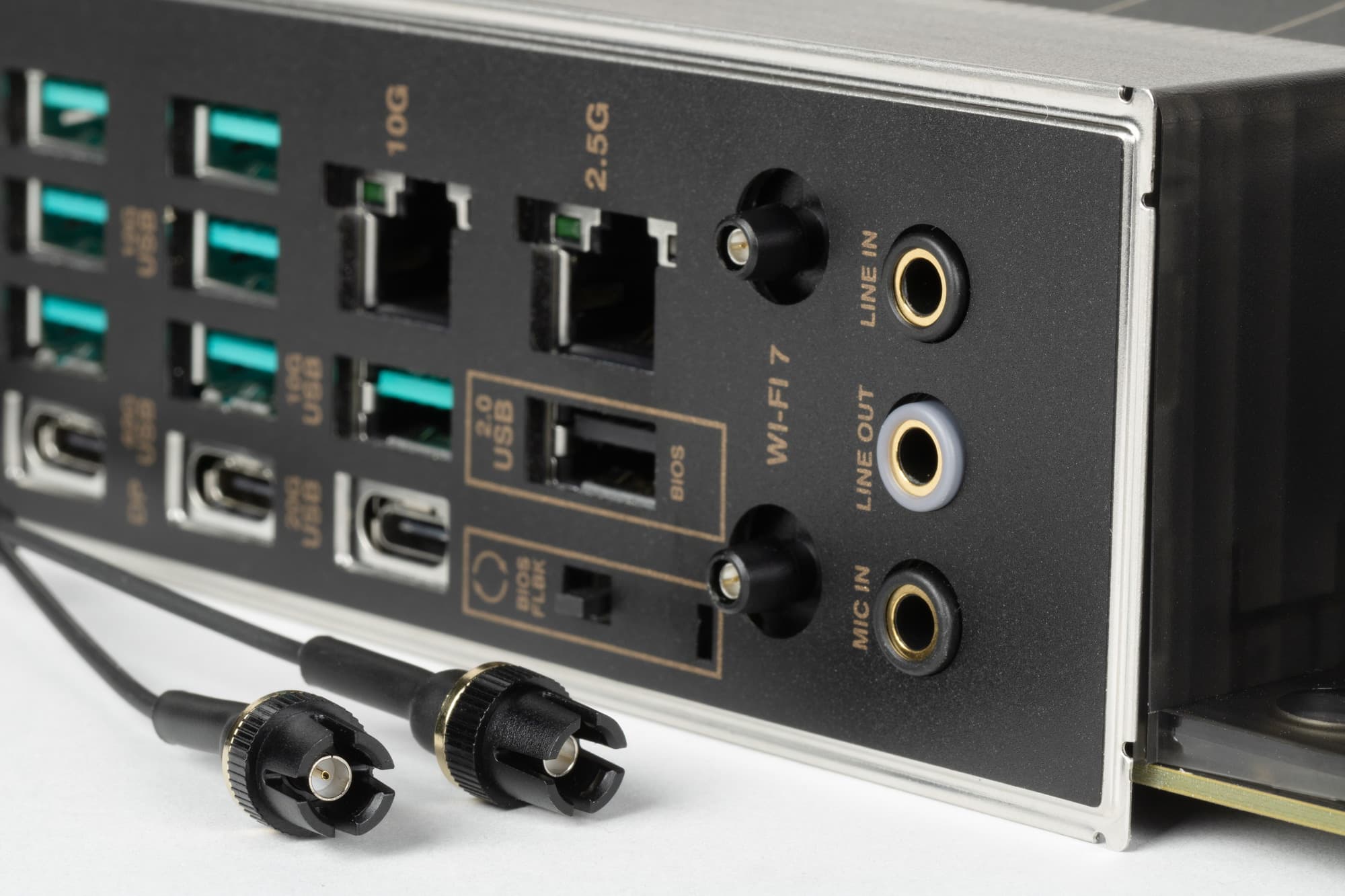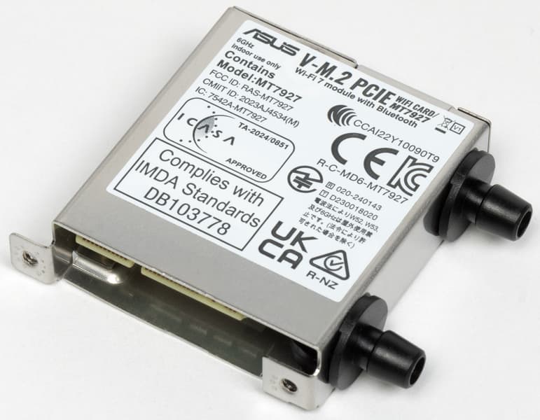 Имеется и комплексный беспроводной адаптер на контроллере MediaTek MT7927, через который реализованы Wi-Fi 7 (802.11a/b/g/n/ac/ax/be) и Bluetooth 5.4. Он установлен в слот M.2 (E-key), и его разъемы для привинчивания выносных антенн выведены на заднюю панель.