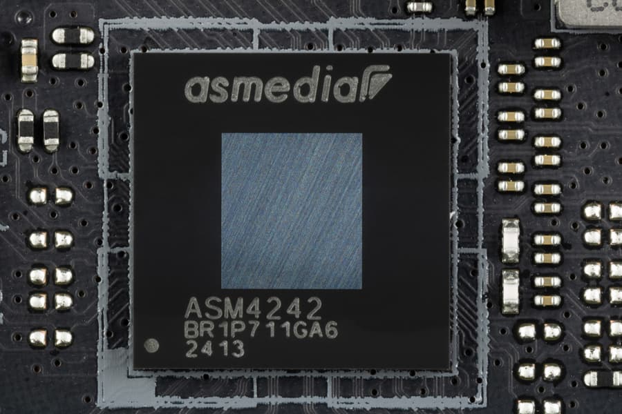 - 2 порта USB4: оба реализованы с помощью хаба ASMedia ASM4242 (на него потрачены 4 линии PCIe 4.0 от CPU) и представлены двумя портами Type-C на задней панели;