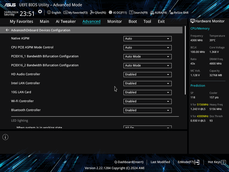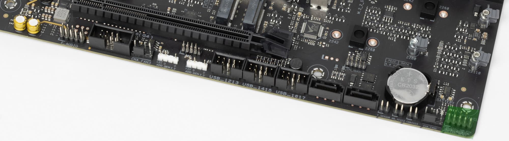 19 линий PCIe оказались занятыми (12 PCIe 4.0 + 7 PCIe 3.0). В данном случае связь с аудиокодеком идет через внутренний HDA. На поддержку BT (при наличии слота M.2 (key E) расходуется один USB 2.0, контроллер подсветки Aura, а также контроллер Flashback для своих нужд используют сигнальные линии USB 2.0, плюс хаб ITE ITE8857 использует линии USB 3.2 Gen2 от CPU. Детально об этом ниже в разделе USB-портов.