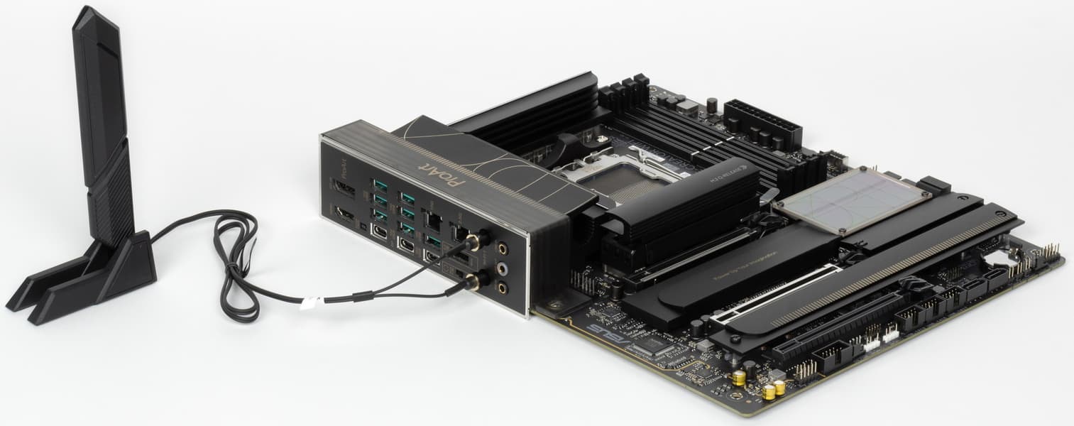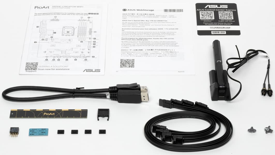 Комплект поставки минимален, однако соответствует нуждам продукта данной серии: кроме традиционных элементов типа руководства пользователя и кабелей SATA, имеются антенна встроенного Wi-Fi-модуля, запасные держатели для М.2 слотов, адаптер DisplayPort – Type-C (для подключения вывода графики из дискретной карты через USB4), фирменный адаптер для передней панели, бонусная линейка серии ProArt и карта с лицензией на установку Asus Control Center.