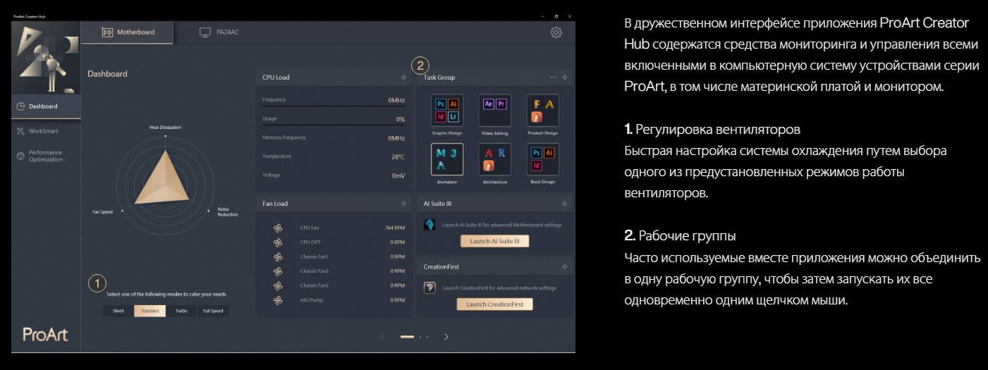 Серия ProArt самим производителем позиционируется как продукты для рабочих ПК в большей степени, там что-то есть от серии Prime (просто и сердито), дизайн строгий и невзрачный (как у Workstation), но на таких ПК можно и неплохо поиграть. Короче, берется продукт из ROG, выбрасываются все оверклокерские фишки, удаляется подсветка, перекрашивается как Prime, на радиаторы наносят шкалы, таблицу Менделеева и т.п. (шутка).