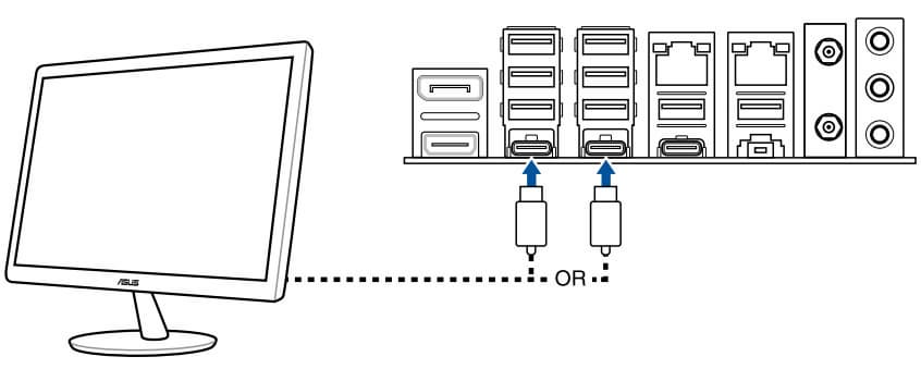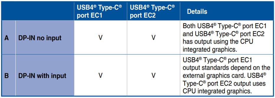 Если вывод графики производится со встроенного в процессор Ryzen графического ядра, то для вывода через Type-C можно использовать любой из двух портов USB4. Если же имеется дискретная видеокарта, то для вывода ее изображения через Type-C следует подключать монитор к порту EC1, второй же порт EC2 используется для вывода только встроенной в процессор графики.