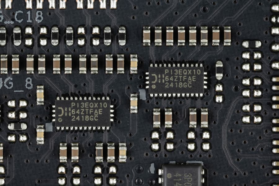 Как видим, перераспределение линий PCIe между слотами у этой материнки имеется, поэтому востребованы мультиплексоры PI2DBS2212XEBEX от Diodes Inc.