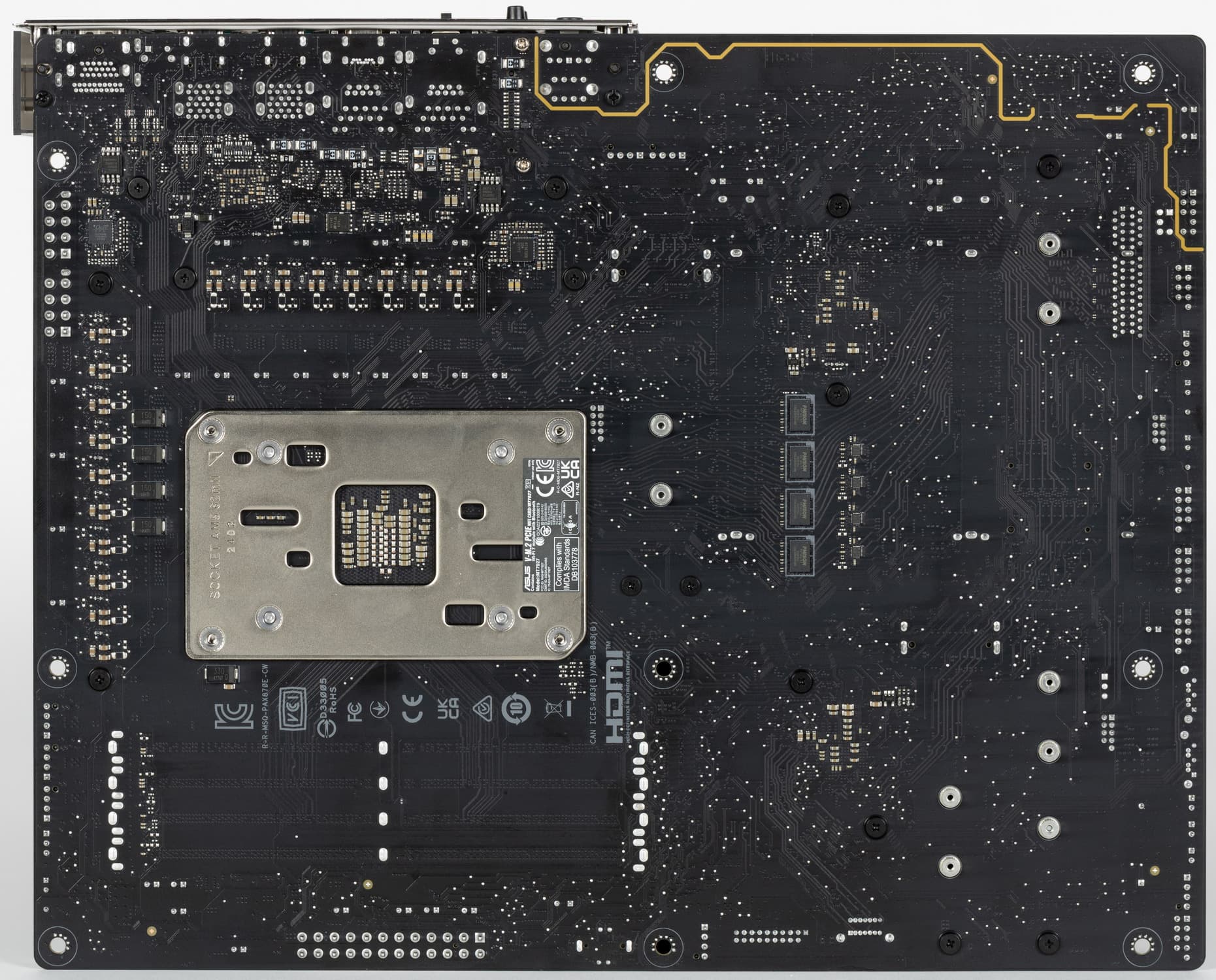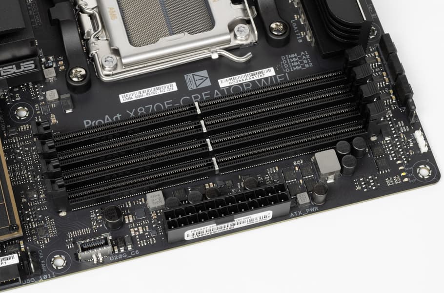 Форм-фактор ATX имеет размеры до 305×244 мм, а E-ATX — до 305×330 мм. Материнская плата Asus ProArt X870E-Creator WiFi имеет размеры 305×244 мм, поэтому выполнена в форм-факторе ATX, и на ней имеются 9 монтажных отверстий для установки в корпус.