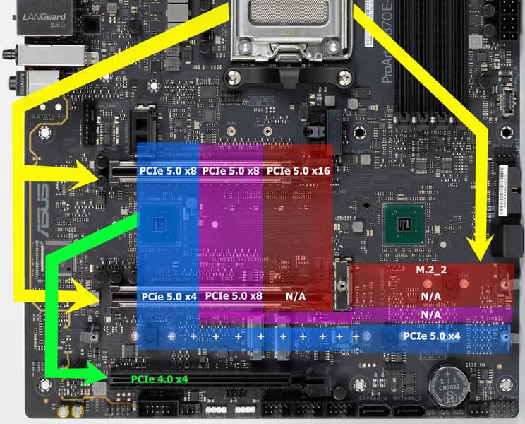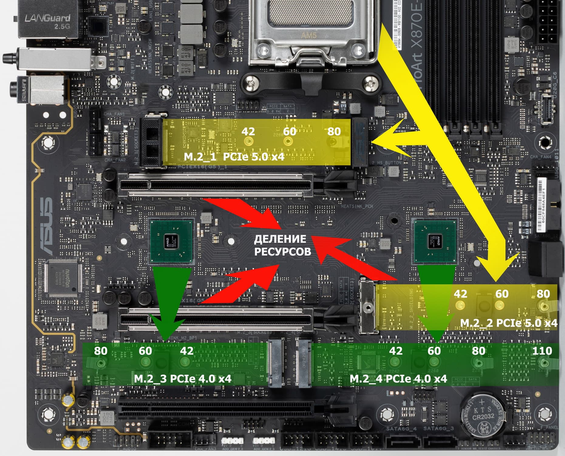 Теперь посмотрим выше на то, как работают процессоры в данной конфигурации. У всех Ryzen 7xxx/8xxx/9xxx — 24 линии PCIe (плюс 4 линии на даунлинк с чипсетом). Смотрим распределение: