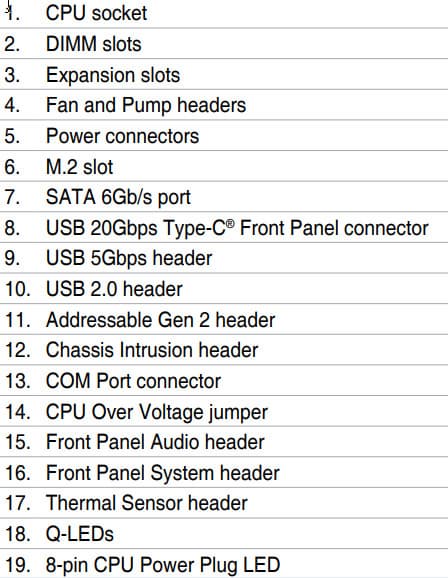 | Прочие внутренние элементы | 24-контактный разъем питания ATX 2 8-контактных разъема питания EPS12V 1 слот M.2 (E-key), занят адаптером беспроводных сетей 1 разъем для подключения порта USB 3.2 Gen2x2 Type-C 1 разъем для подключения 2 портов USB 3.2 Gen1 3 разъема для подключения 6 портов USB 2.0 8 разъемов для подключения 4-контактных вентиляторов и помп ЖСО 3 разъема для подключения адресуемой ARGB-ленты 1 разъем аудио для передней панели корпуса 1 разъем COM-порта 1 переключатель OV_CPU 1 разъем для термодатчикa 1 разъем для подключения управления с передней панели корпуса |