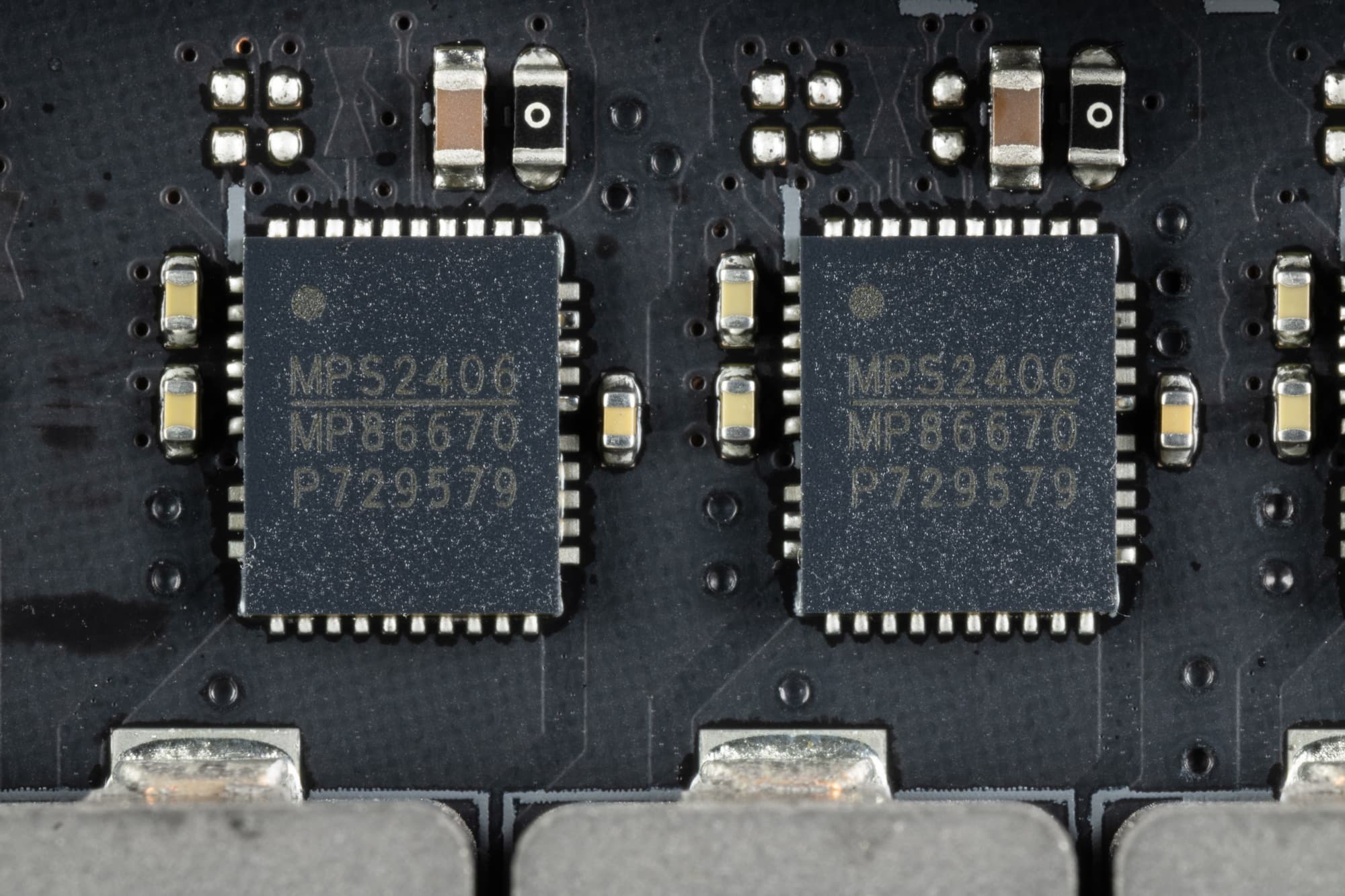 Каждый канал фазы VCore и встроенной графики имеет суперферритовый дроссель и транзисторную сборку MP86670 от Monolith Power Systems (до 70A).