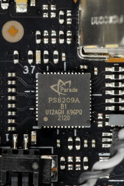 Конечно же нельзя пройти мимо такого мощного инструмента, как Intel Thunderbolt 4. Плата комплектуется соответствующим контроллером на основе Intel JHL8540, который распаян на материнской плате.